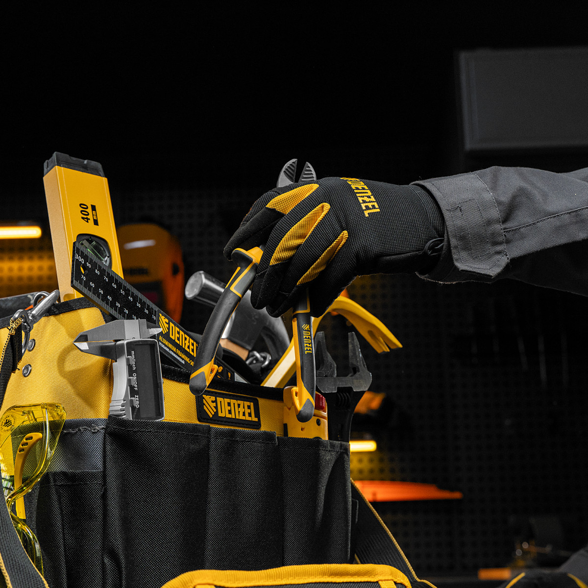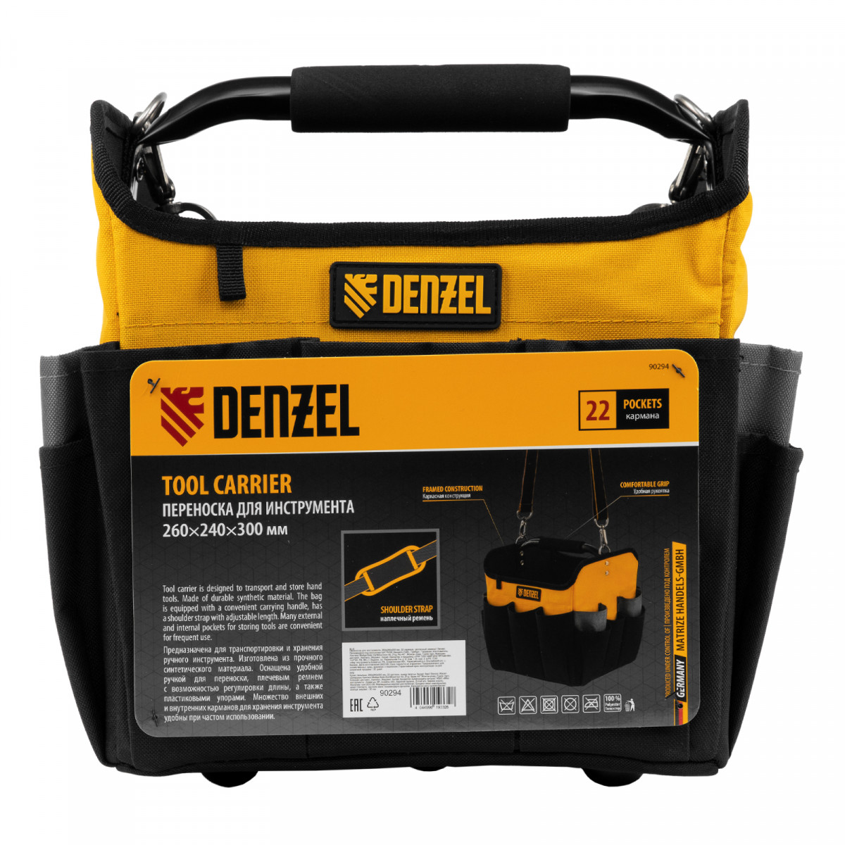 Переноска Denzel 90294 габаритами 260 х 240 х 300 мм, с наплечным ремнем, имеет вместительное основное отделение и 22 кармана. В ней можно разместить ручной и электроинструмент для хранения и транспортировки. Переноска пригодится в дороге, дома или в гараже.