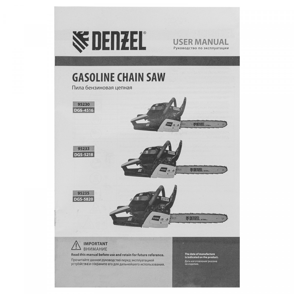 Пила цепная бензиновая DGS-4516, шина 40 см, 45 см3, 3 л.с, шаг 3/8, паз 1.3 мм, 57 звеньев Denzel