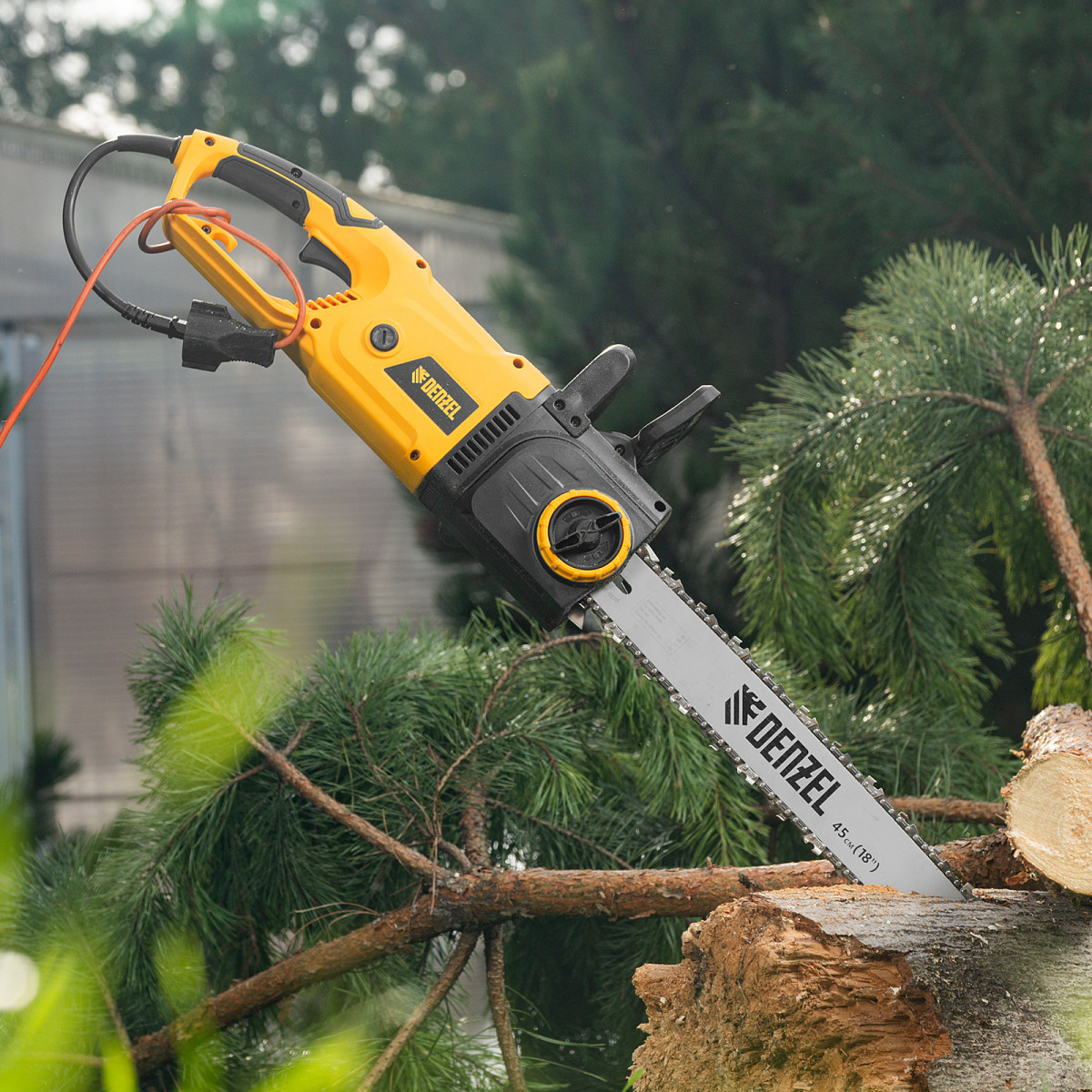 Пила цепная электрическая EDS-2200, 2.2 кВт,продольная, шина 45 см, шаг 3/8, паз 1.3 мм, 62 звена Denzel