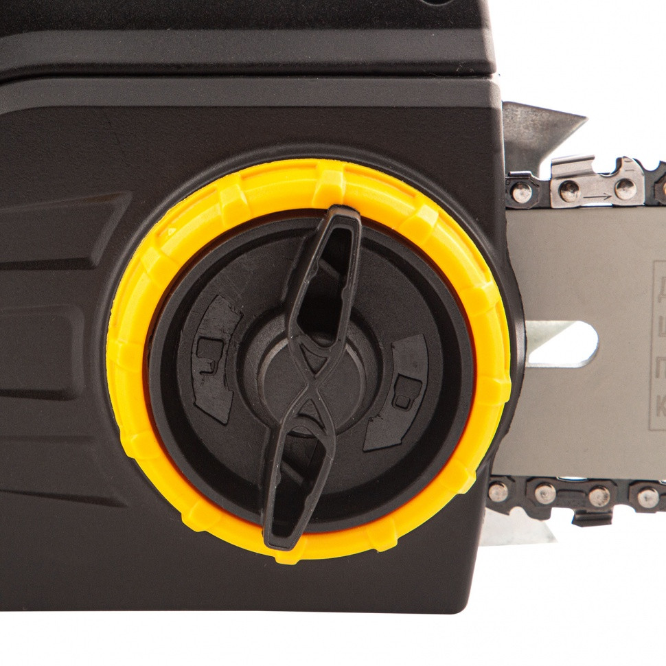 - Безопасная эксплуатация — блокировка пуска предотвращает случайное включение пилы, инерционный тормоз цепи мгновенно останавливает ее вращение при резком отскоке инструмента в сторону пользователя.