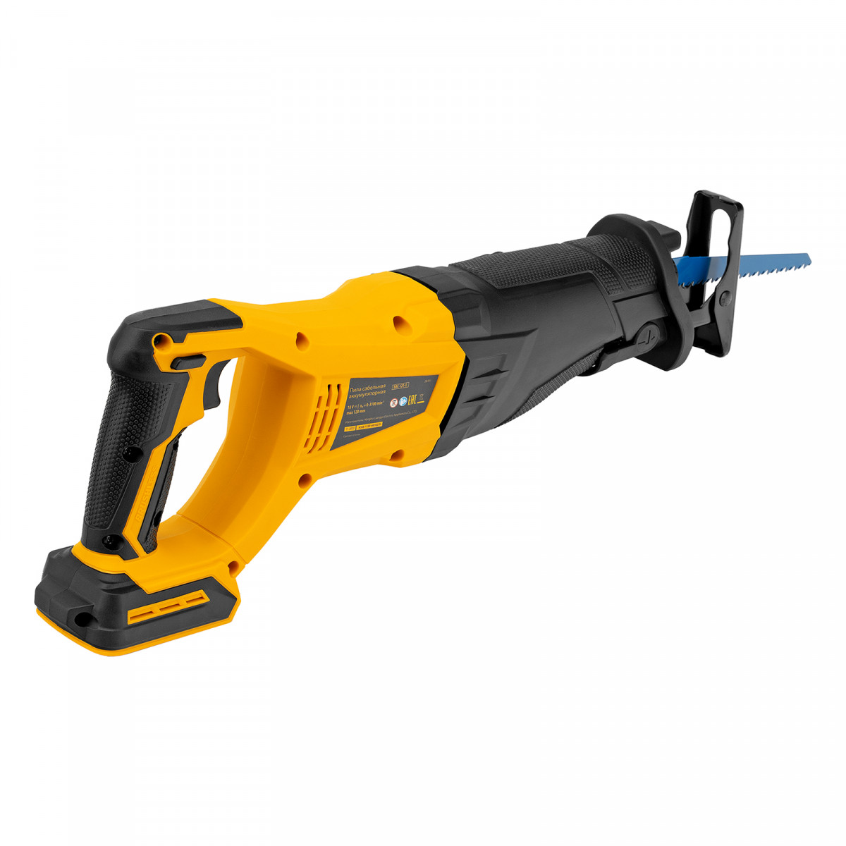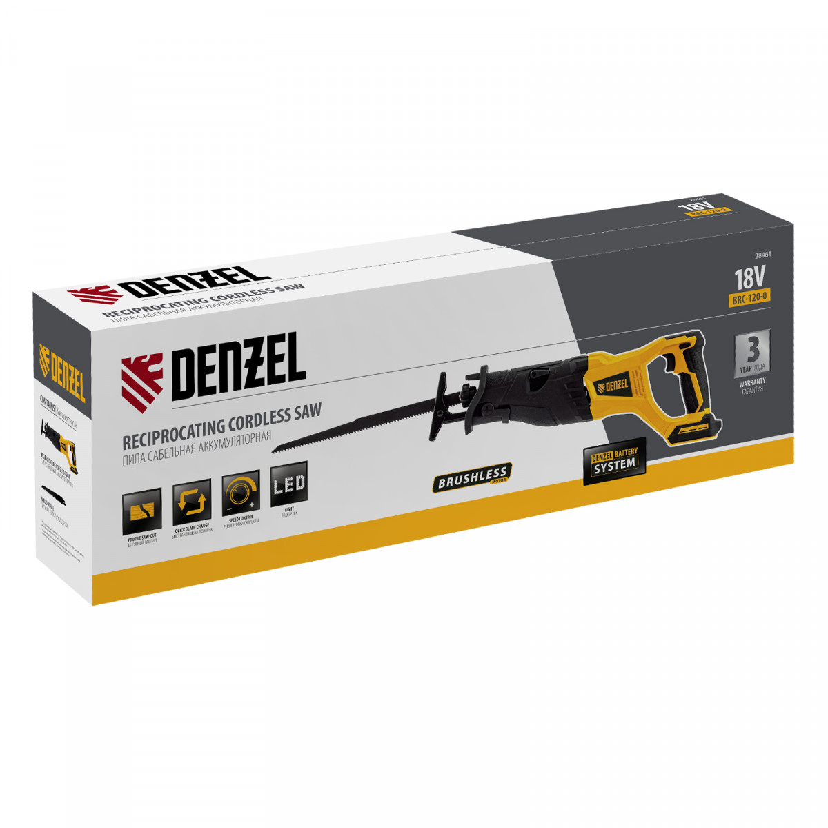 Сабельная аккумуляторная пила Denzel BRC-120-0 28461 с бесщеточным двигателем работает от аккумулятора Li-Ion с рабочим напряжением 18 В. Предназначена для распила фанеры, досок, ДСП, ДВП, пластика, а также для обрезки веток. Максимальная глубина пропила в древесине составляет 120 мм, в стали — 10 мм. Оснастка совершает до 3100 ходов в минуту, что обеспечивает эффективную работу. ,Пила поставляется без аккумулятора и зарядного устройства, к ней подходит универсальный аккумулятор емкостью 4 А/ч, совместимый с любым инструментом единой платформы Denzel battery system 18V серии IB.