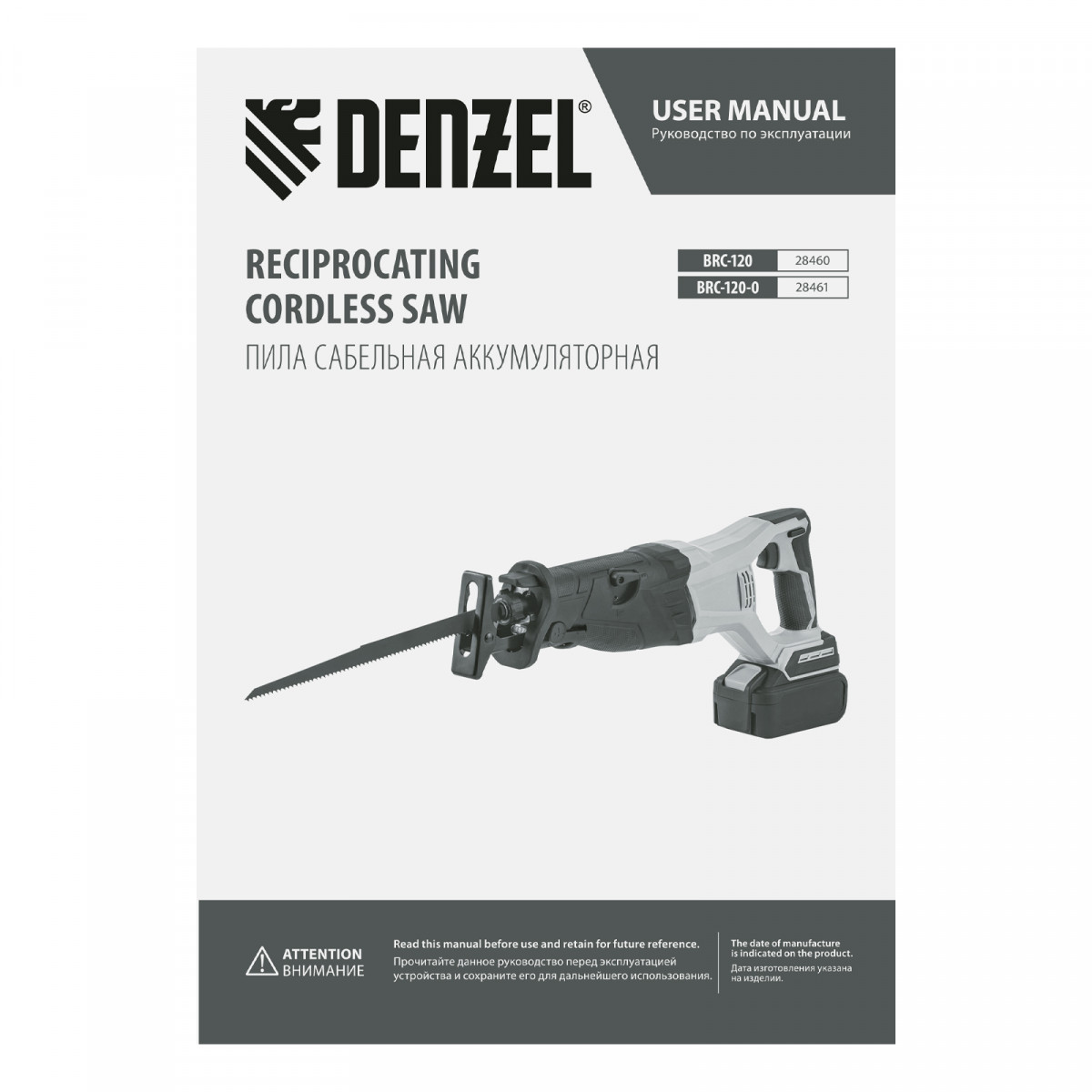 Пила сабельная аккумуляторная бесщет BRC-120-0, 18В Li-Ion Denzel