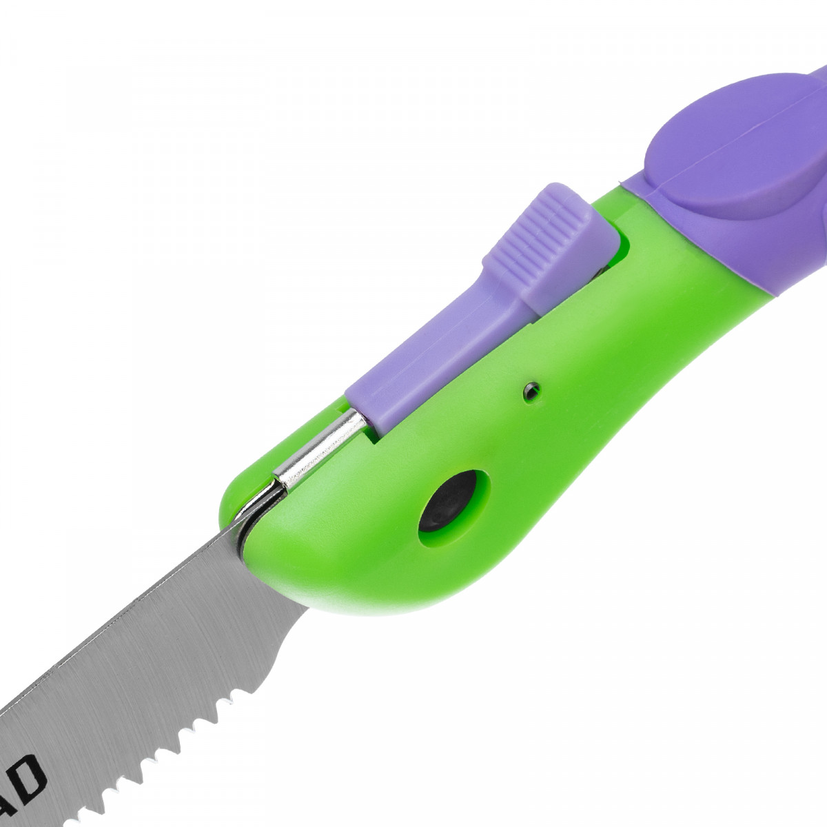 - Безопасное хранение и транспортировка — кнопочный фиксатор надежно удерживает лезвие в сложенном состоянии.