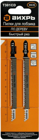 Пилки для лобзика Т301CD по дереву,быстрый рез 116х90мм (2 шт) Вихрь