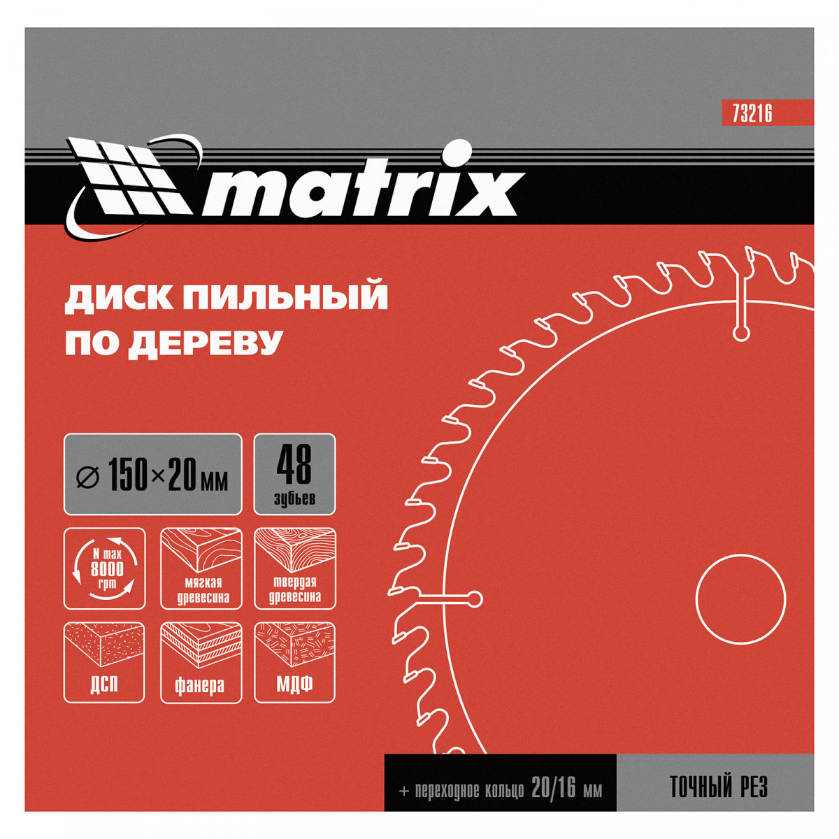Пильный диск по дереву, 150 х 20 мм, 48 зубьев, кольцо 16/20 Matrix Professional