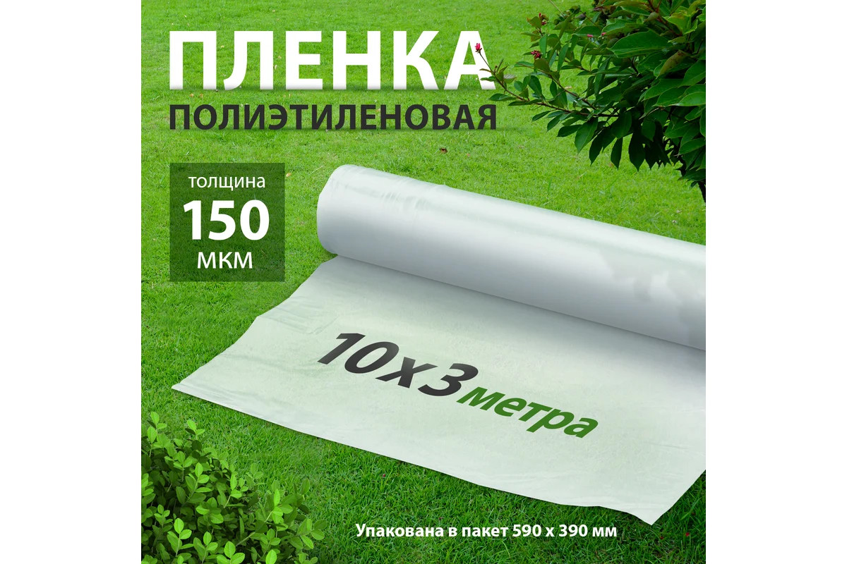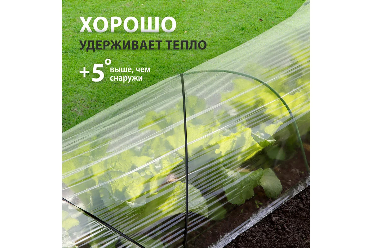 Фасованная полиэтиленовая пленка используется для обшивки каркасов парников и теплиц, укрывания силосных ям и выращивания рассады. Плотная пленка успешно противостоит ветру и осадкам, не пропускает влагу и ультрафиолет, но обеспечивает растениям достаточное освещение. Материал также будет полезен в строительстве для защиты стройматериалов и конструкций, покрытых сохнущими растворами, а также для укрывания поверхностей и предметов обстановки во время проведения ремонтных работ. Преимущества: - Высокая прочность и эластичность — пленка изготовлена из первичного полиэтилена и не содержит посторонних примесей. - Сохранение тепла — пленка поддерживает температуру в парнике или теплице приблизительно на 5 градусов выше, чем снаружи, поэтому растения надежно защищены от возвратных заморозков и холодных рос.