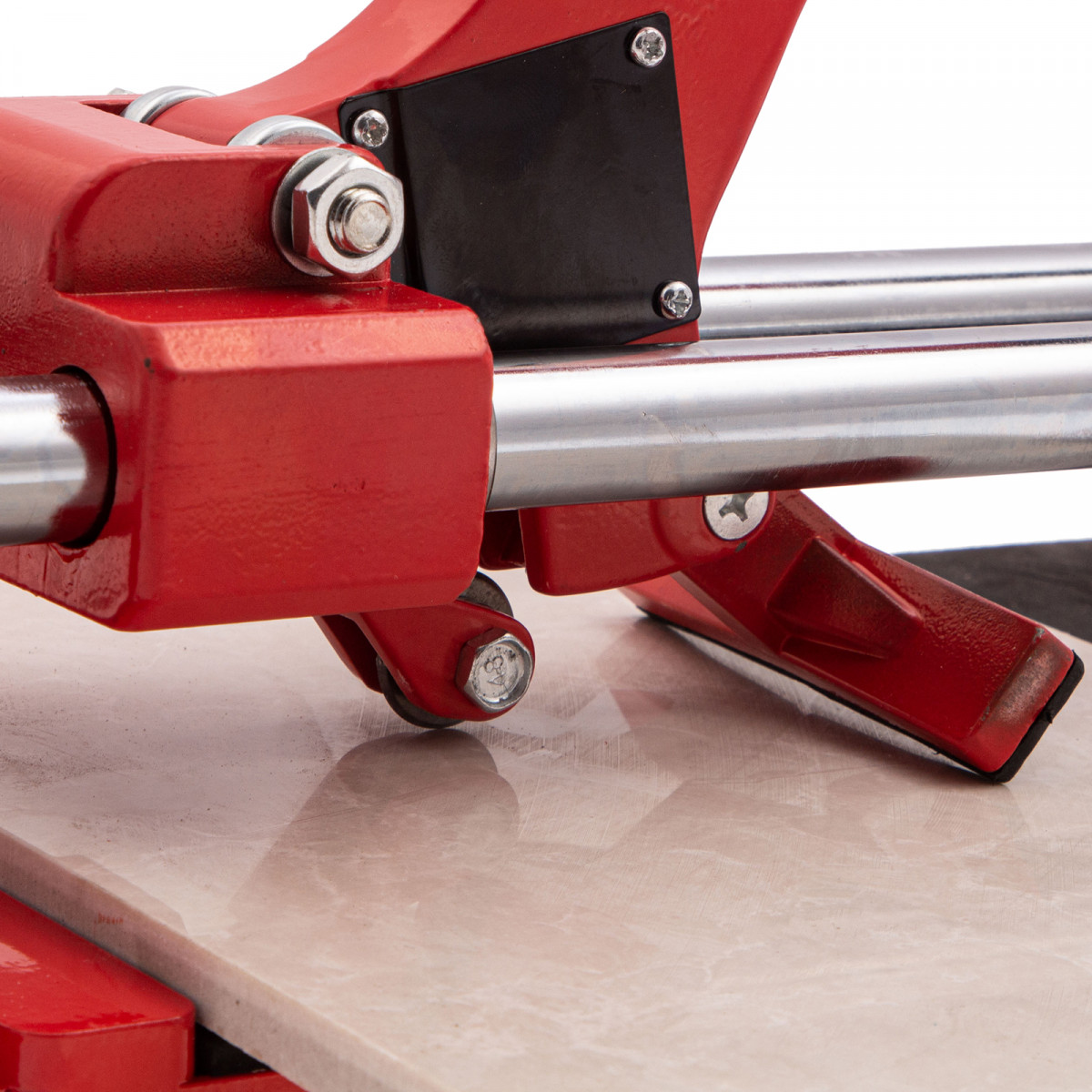 - Устойчивое основание и неподвижность плитки — плиткорез снабжен цельнолитой станиной из алюминиево-магниевого сплава с обрезиненной поверхностью, а также мягкими амортизирующими накладками.