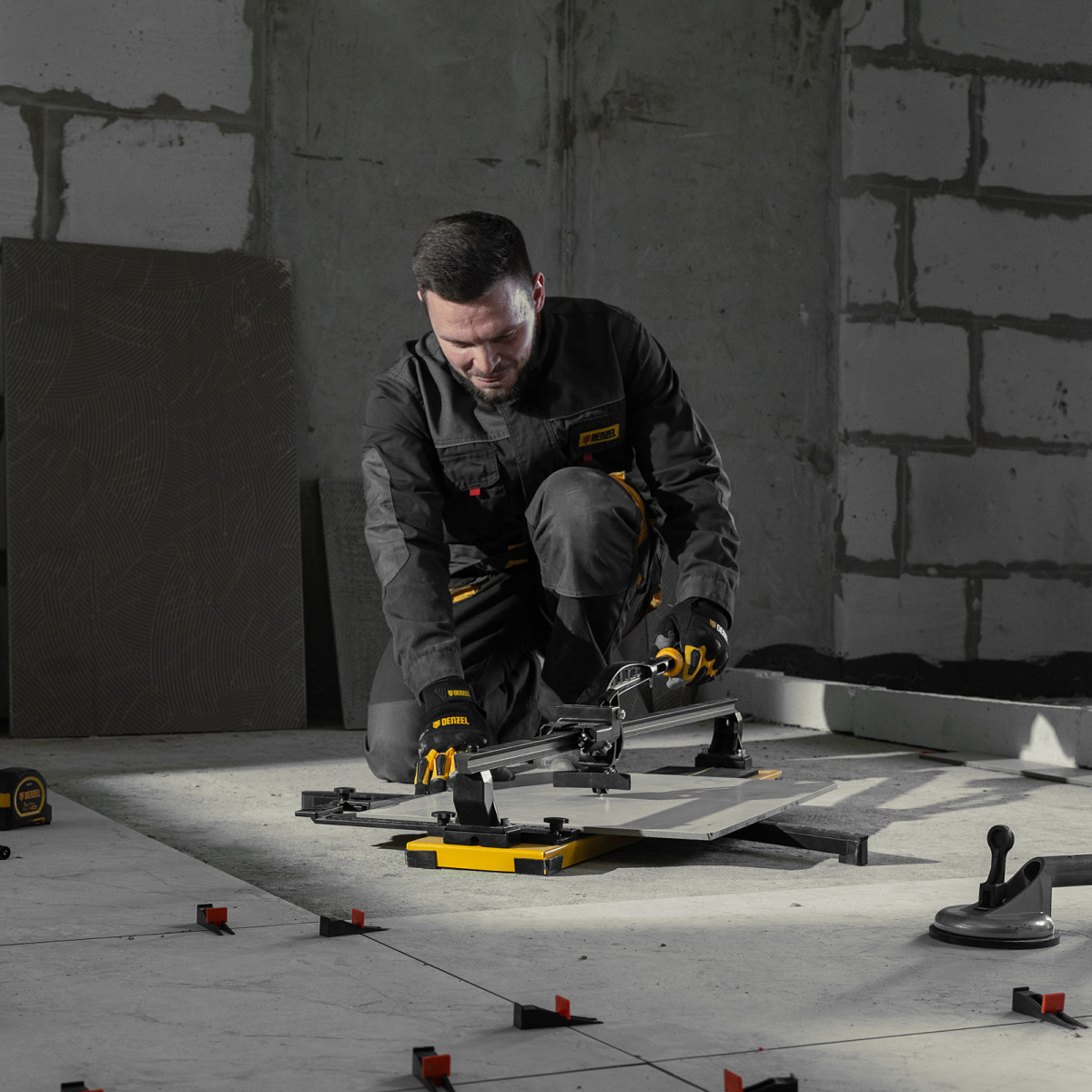 • Удобная работа — благодаря противоскользящим накладкам плиткорез не смещается даже на гладких поверхностях.