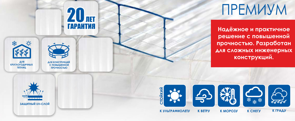 - Защита от ультрафиолетового излучения (специальный защитный слой, нанесенный на наружную поверхность листов, препятствует проникновению наиболее вредных для внутреннего помещения УФ излучений).