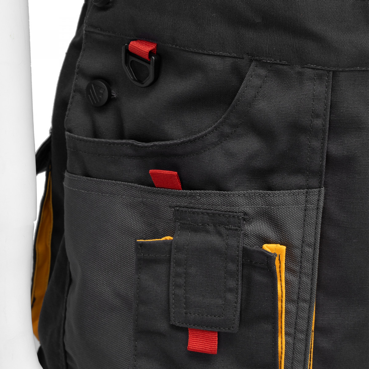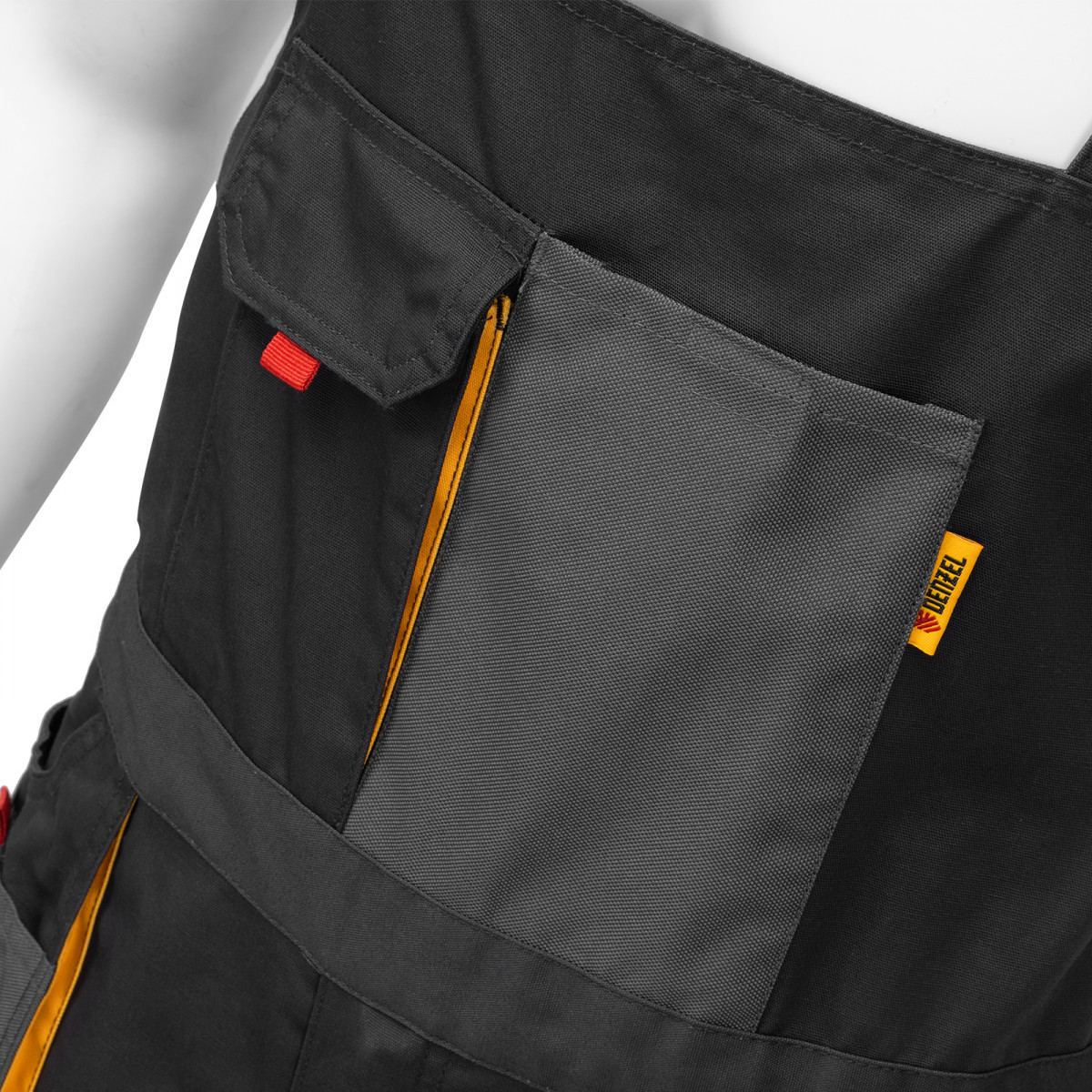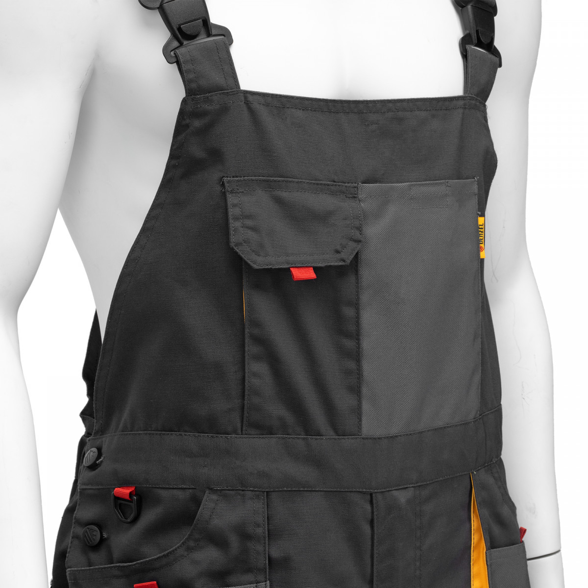 - Большое количество карманов — полукомбинезон снабжен специальными отделениями для инструментов, а в карманах с «липучками» можно разместить мобильный телефон, крепеж и необходимые мелочи.