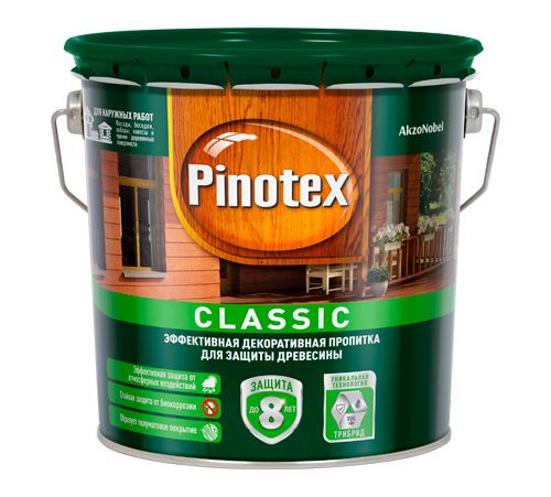 Пропитка cодержит активные добавки против плесени и синевы. Окрашенная поверхность устойчива к воздействию солнца, дождя, снега и мороза. Pinotex Classic легко наносится и быстро впитывается в поверхность древесины, образуя полуматовое покрытие. Подчеркивает естественную текстуру древесины. Для усиленной защиты глубоких слоев древесины от биокоррозии рекомендуется применять пропитку в системе с грунтовкой Pinotex Base. Возможно применение для защиты бревенчатых строений и полукруглых облицовочных профилей.