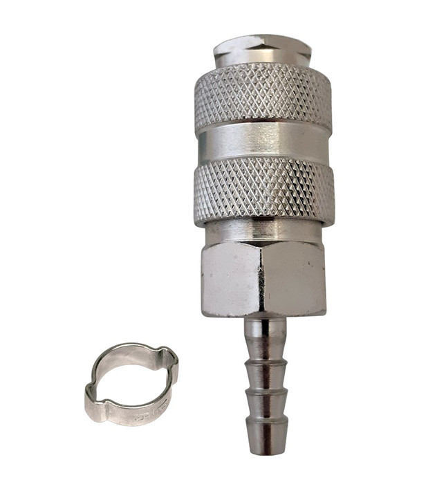 Переходник рапид-елочка для подключения компрессора к пневмоинструменту с помощью шланга. Диаметр шланга 6 мм. Крепление к инструменту - рапид, к шлангу - елочка. Обжимное кольцо 6x11 в комплекте.