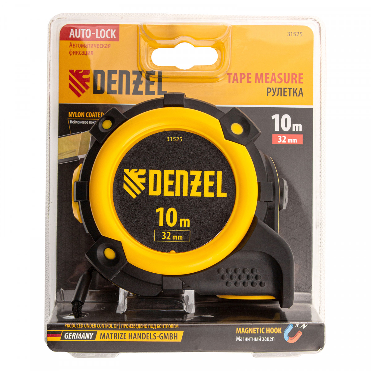 Рулетка 10м х 32мм, автоматич. фиксац., нейлон. покрытие, магнит. зацеп, двухстор. разметка Denzel