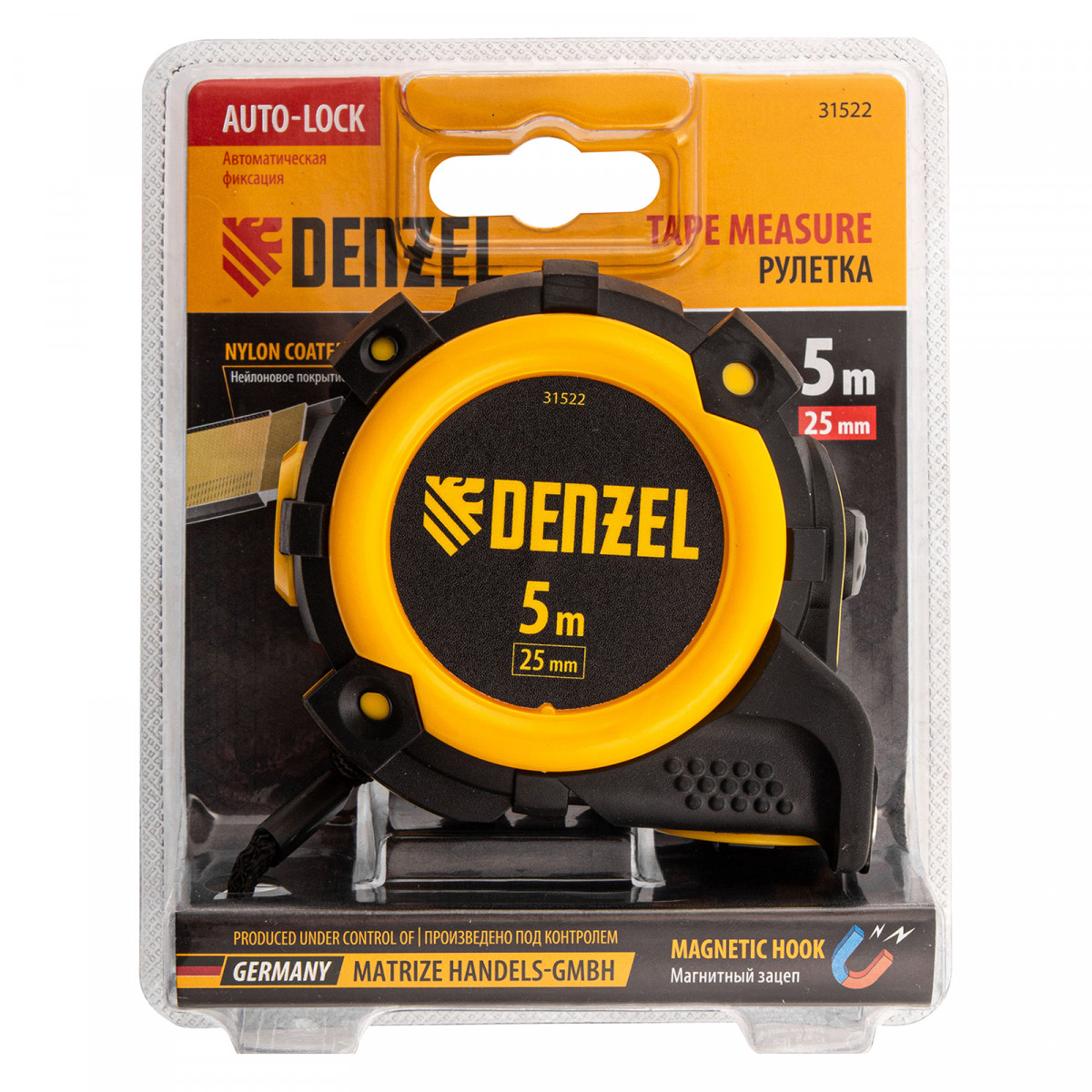 Рулетка 5м х 25мм, автоматич. фиксац., нейлон. покрытие, магнит. зацеп, двухстор. разметка Denzel