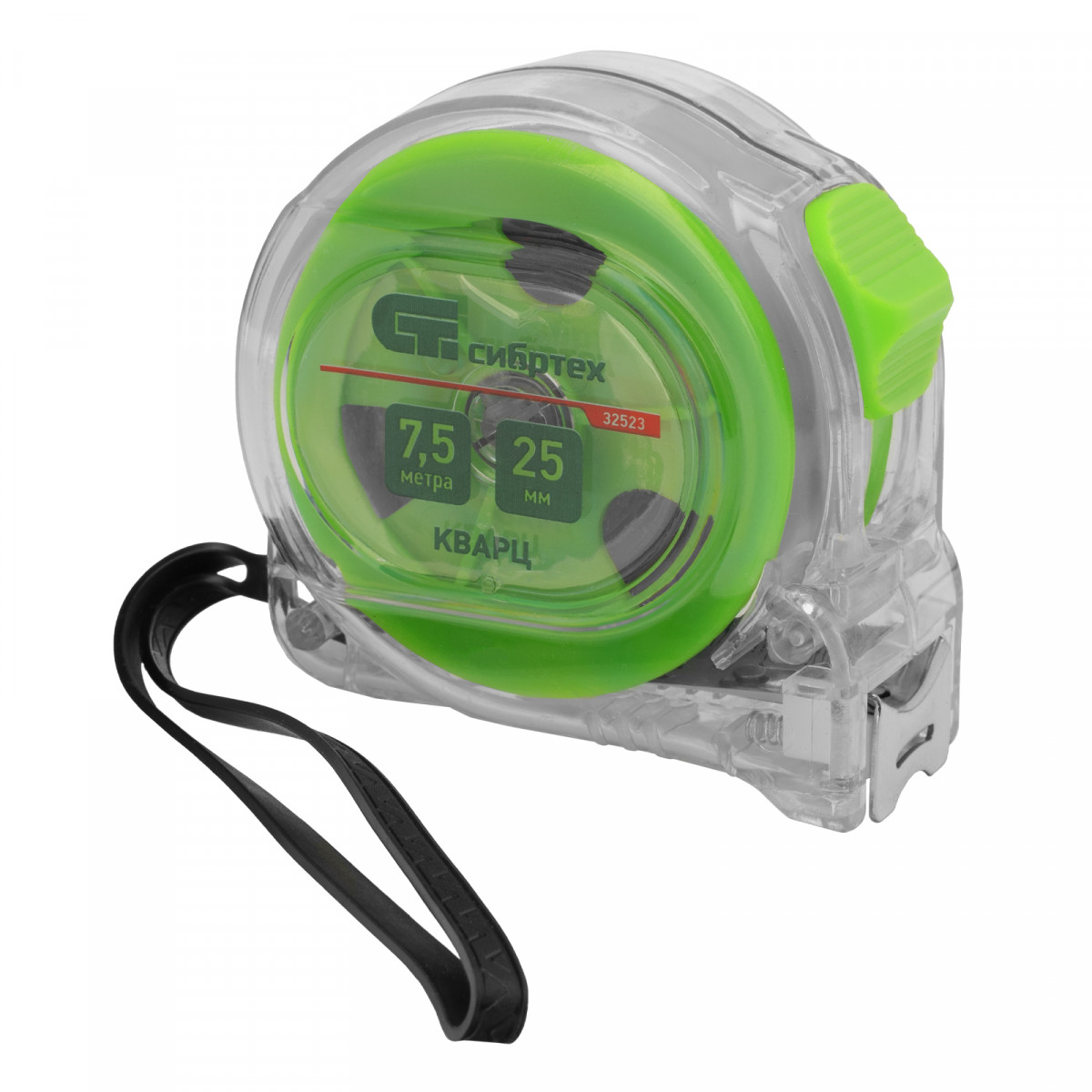 Рулетка Кварц,прозрачный корпус,амортизатор,7,5 м х 25 мм Сибртех