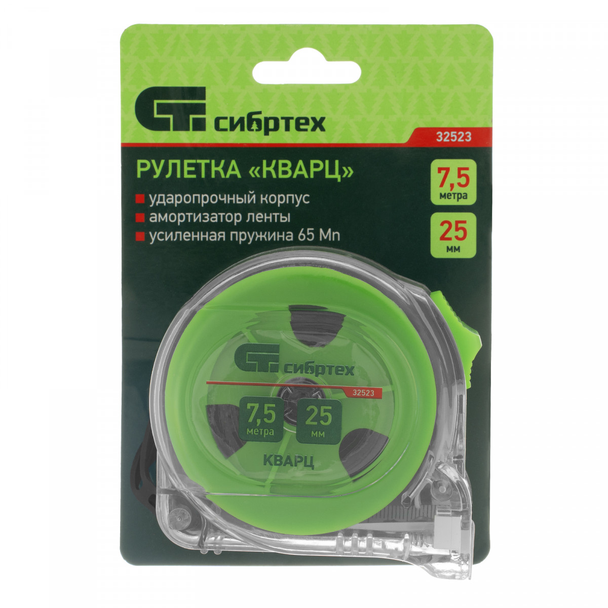 Рулетка Сибртех Кварц 32523 с полотном размером 7,5 м х 25 мм, в прозрачном корпусе, с амортизатором, будет полезна для измерения длины конструкций, строительных материалов и т.д. Пригодится на строительной площадке, в гараже, мастерской и в быту.