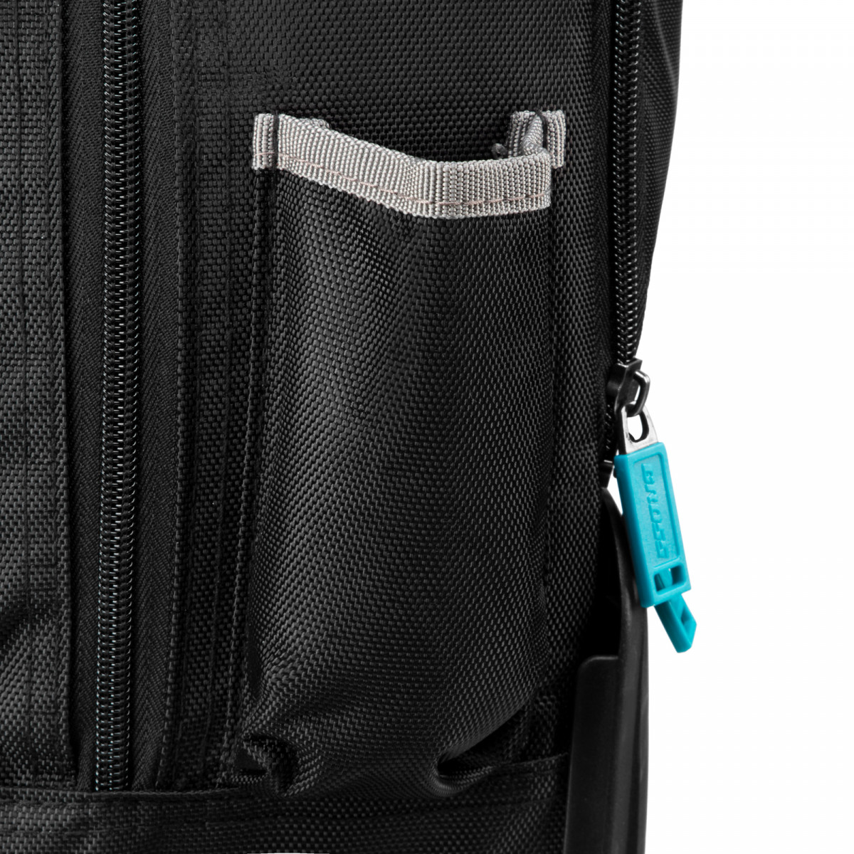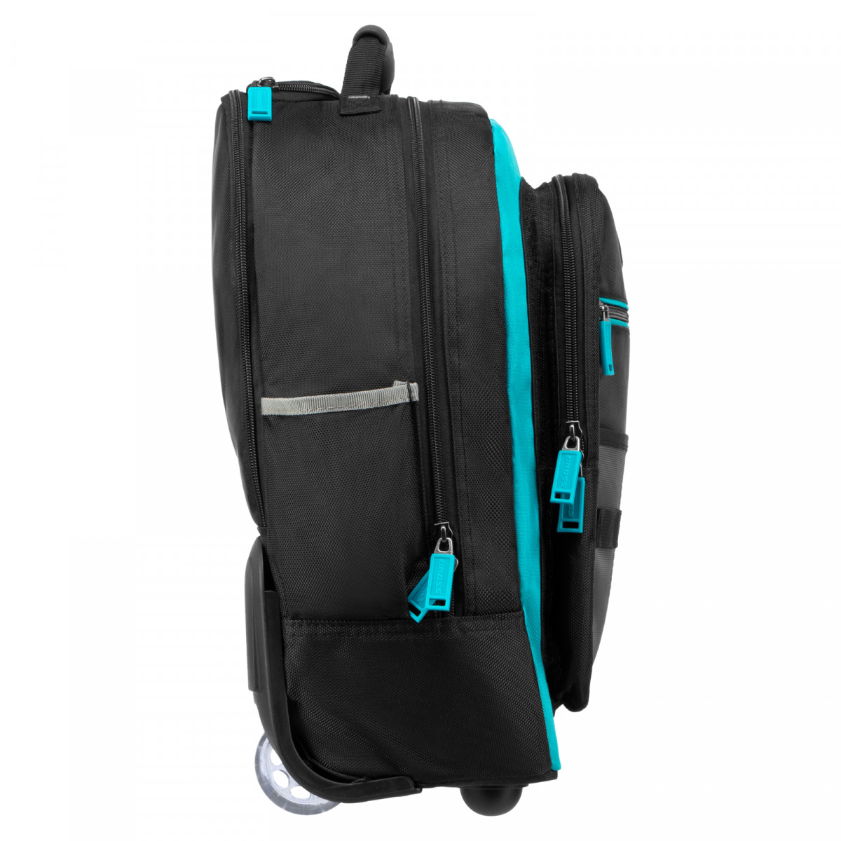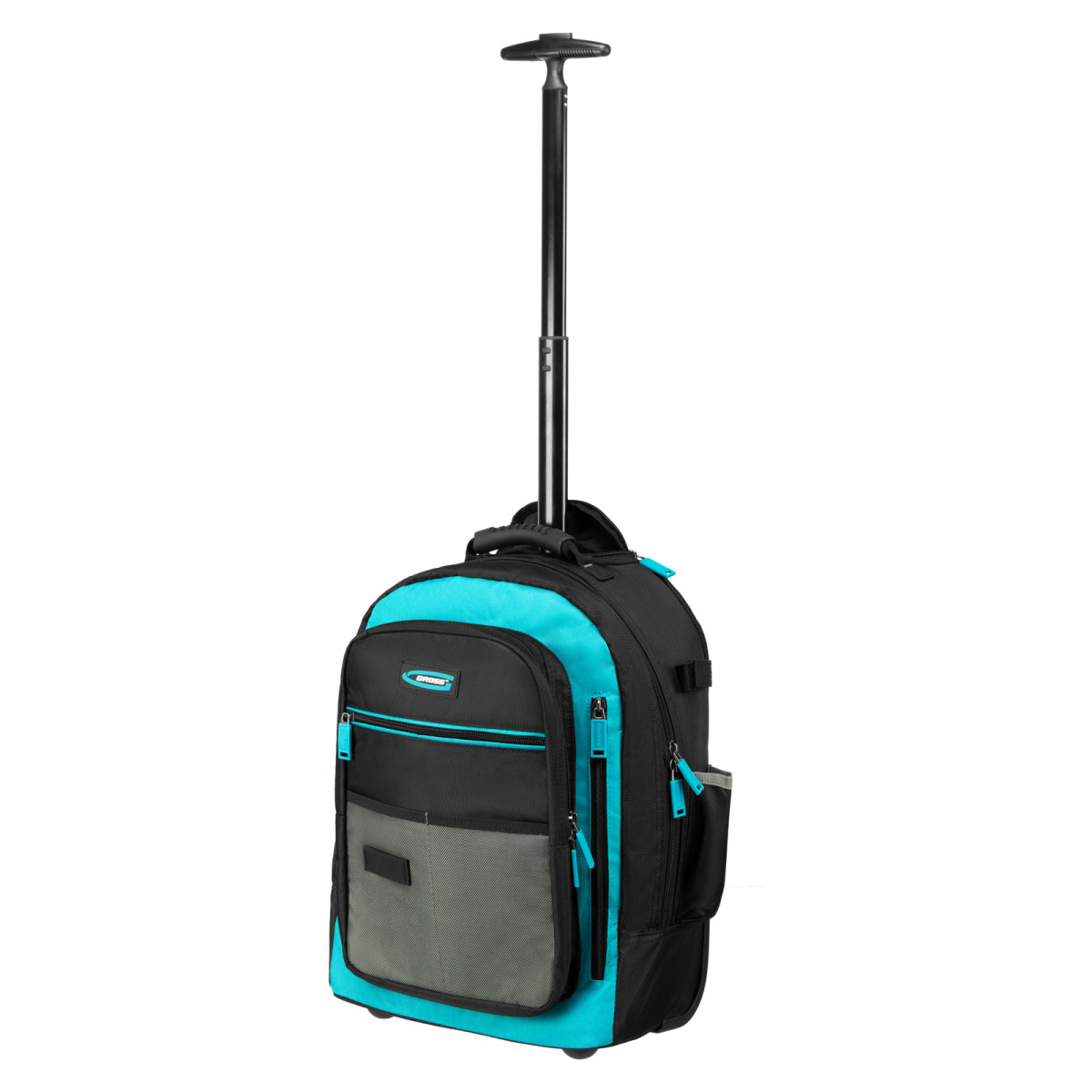 Выдвижная рукоятка и колеса облегчают транспортировку рюкзака с инструментами.