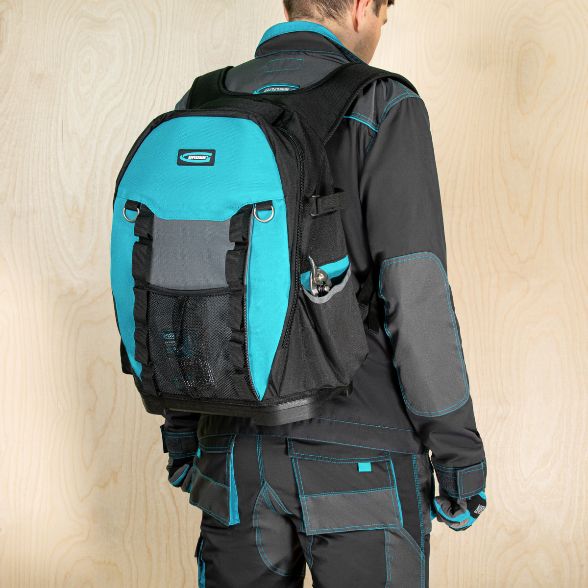 Рюкзак для инструмента Gross Experte 90270 габаритами 360 х 205 х 470 мм, с пластиковым дном и органайзером, имеет 77 карманов различной формы и размера, что позволяет максимально эффективно использовать его пространство. Предназначен для транспортировки и хранения мелкого и крупного инструмента. Органайзер с 70 карманами можно использовать отдельно, а для удобного размещения на рабочем месте предусмотрена специальная петля.