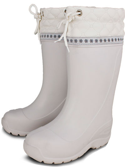 Женские сапоги Умка из ЭВА (этиленвинилацетат). Отличается высокой морозостойкостью и эластичнотью. Специальный состав сырья позволяет сапогу сохранять свои характеристики при отрицательных температурах. Главное преймущество перед традиционно зимними бахилами, ботинками для суровых условий — этоминимальный вес, вес пары сапог составляет до 700 грамм. Затяжная манжета выполнена из водоотталкивающей ткани, что препятствует попаданию снега во внутрь сапога. Комплектуется утеплителем, изготовленным с применением натурального меха, что позволяет находится на морозе до -40С.