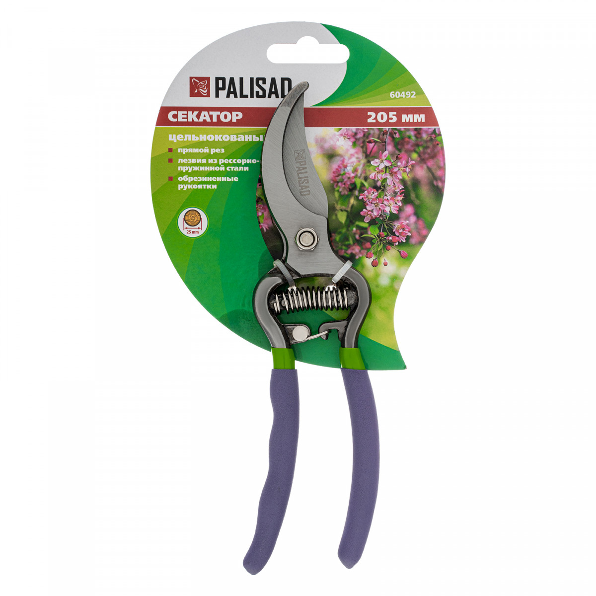 Цельнометаллический секатор прямого реза Palisad 60492 — инструмент для обрезки живых веток диаметром до 25 мм, использующийся для ухода за растительностью на дачном участке. Лезвия, движущиеся в параллельных плоскостях, производят ровный и чистый срез, минимально повреждая растение. Плотность смыкания лезвий можно отрегулировать при помощи винта.
