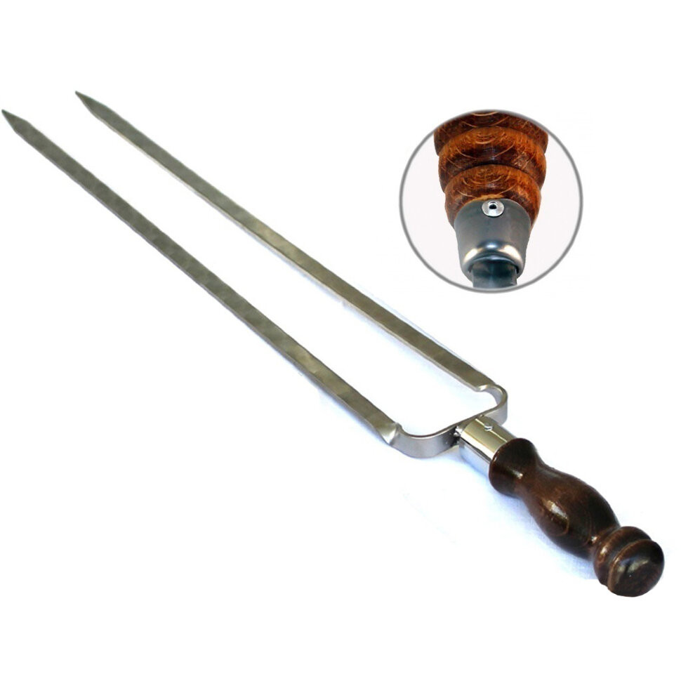 Шампур-вилка из нержавеющей стали толщиной 3 мм с деревянной ручкой. На ручке сделана заклепка для защиты ручки от огня и жара из мангала. Рабочая длина шампура 450 мм - Это длина только лезвия. Шампура из стали 3 мм удобны для больших кусков мяса, за счет толщины шампур не гнётся, а нагревшись начинает нагревать мясо внутри. Ручка шампура деревянная - удобная в обращении, покрыта лаком, эстетически - очень красивая, практически - долговечная. Двойной шампур чаще всего используют для приготовления целой курицы.