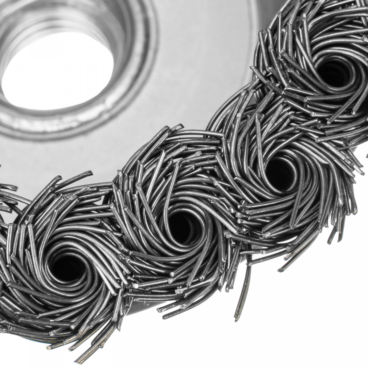 Щетка Сибртех «Чашка» 746287 диаметром 100 мм, с присоединительной резьбой М14, с щетиной из крученой проволоки диаметром 0,5 мм, устанавливается на УШМ, поддерживающую работу со скоростью 8500 об/мин. Изделие предназначено для грубой (черновой) обработки поверхностей и подходит для удаления загрязнений, снятия толстого слоя ржавчины, ЛКМ, зачистки сварных швов.