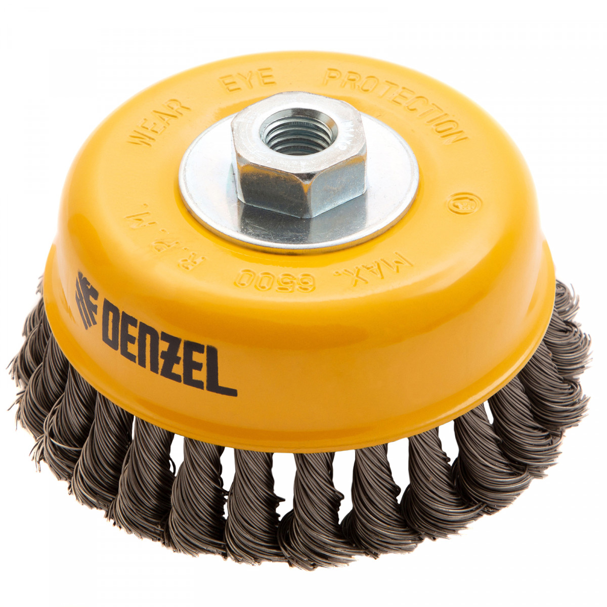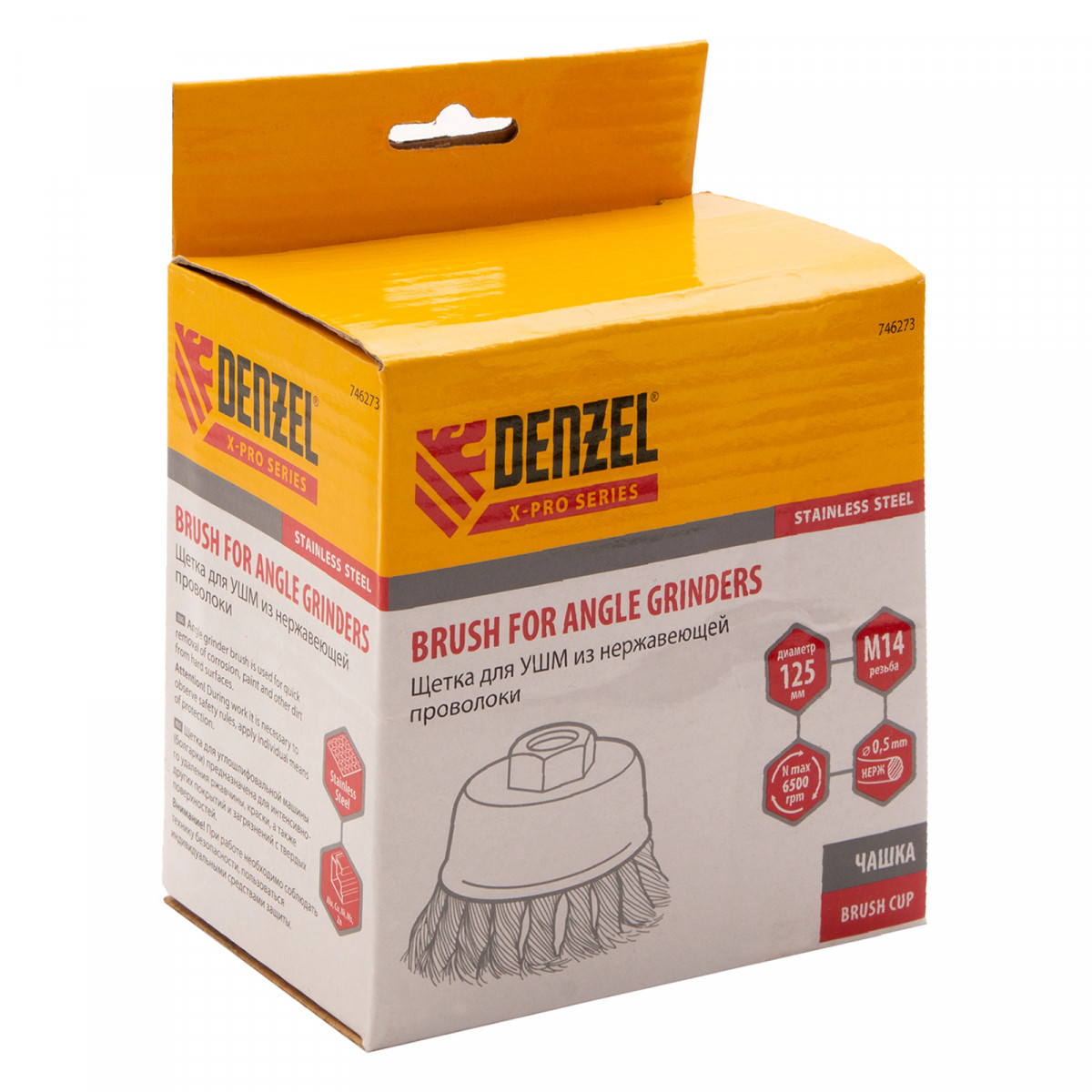 Щетка для УШМ «Чашка» Denzel 746273, М14, диаметром 125 мм, с щетиной из крученой нержавеющей проволоки диаметром 0,5 мм, предназначена для грубой очистки твердых поверхностей от ржавчины, лакокрасочных покрытий, загрязнений, удаления заусенцев, а также для зачистки сварных швов. Снимает толстый слой материала, идеально подходит для обработки изделий из нержавеющей стали. Щетка имеет форму чашки и позволяет очищать участки большой площади. Оснастку устанавливают на вал углошлифовальной машины. Рекомендуемая максимальная скорость вращения составляет 6500 об/мин. Во время работы следует использовать средства индивидуальной защиты — очки, респиратор, наушники, перчатки, а также специальную одежду и обувь. Щетка применяется в строительстве, на производстве, а также в быту.