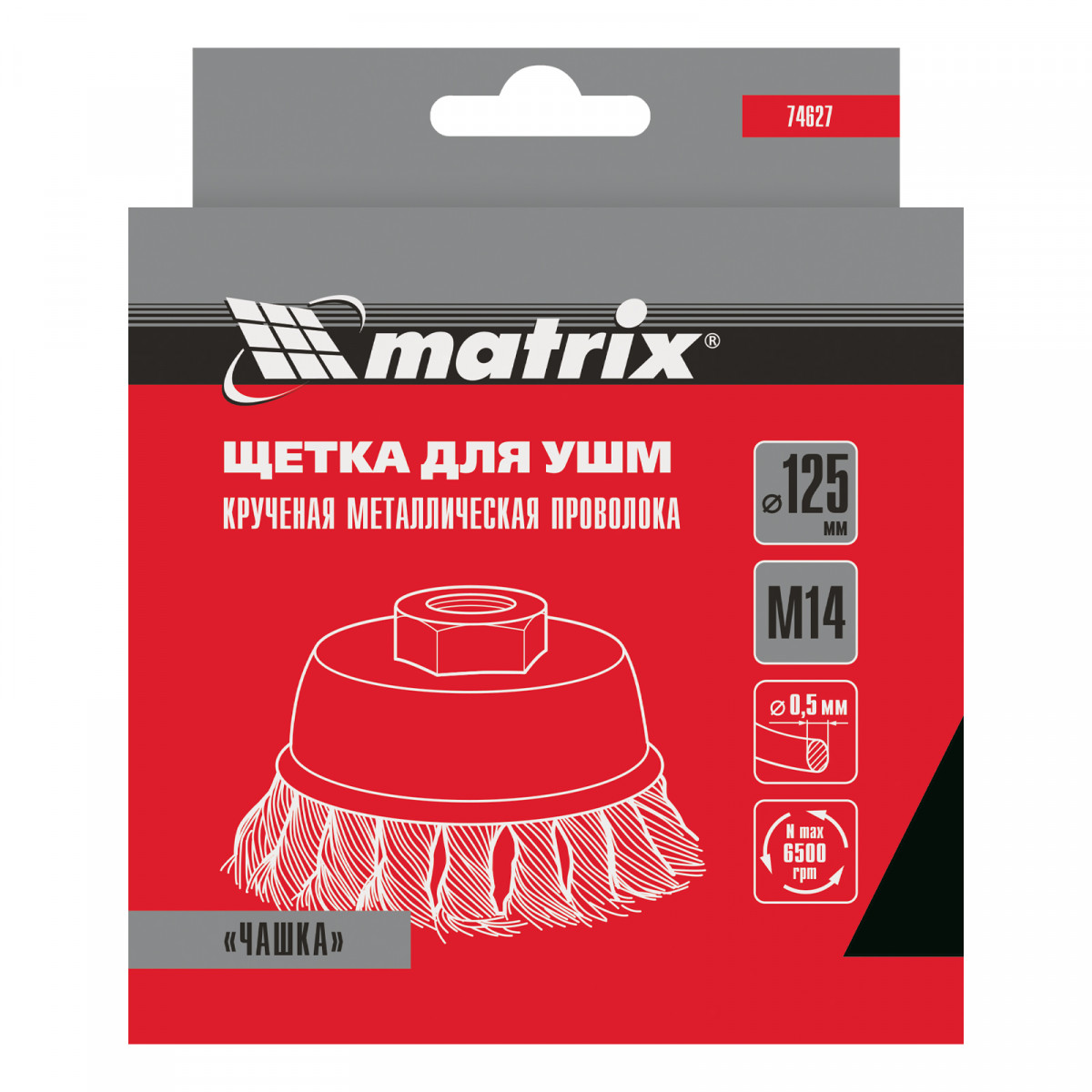 Щетка Matrix «Чашка» 74627 диаметром 125 мм, с присоединительной резьбой М14, с щетиной из крученой проволоки диаметром 0,5 мм, устанавливается на УШМ, поддерживающую работу со скоростью 6500 об/мин. Изделие предназначено для грубой (черновой) обработки поверхностей и подходит для удаления загрязнений, снятия толстого слоя ржавчины, ЛКМ, зачистки сварных швов.