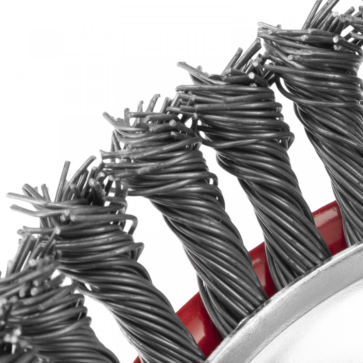 Щетка Matrix «Чашка» 74625 диаметром 125 мм, с присоединительной резьбой М14, с щетиной из крученой проволоки диаметром 0,8 мм, устанавливается на УШМ, поддерживающую работу со скоростью 6500 об/мин. Щетина предназначена для грубой (черновой) обработки поверхностей, более агрессивной по сравнению с щетиной 0,5 мм. Изделие подходит для удаления загрязнений, снятия толстого слоя ржавчины, ЛКМ, зачистки сварных швов.