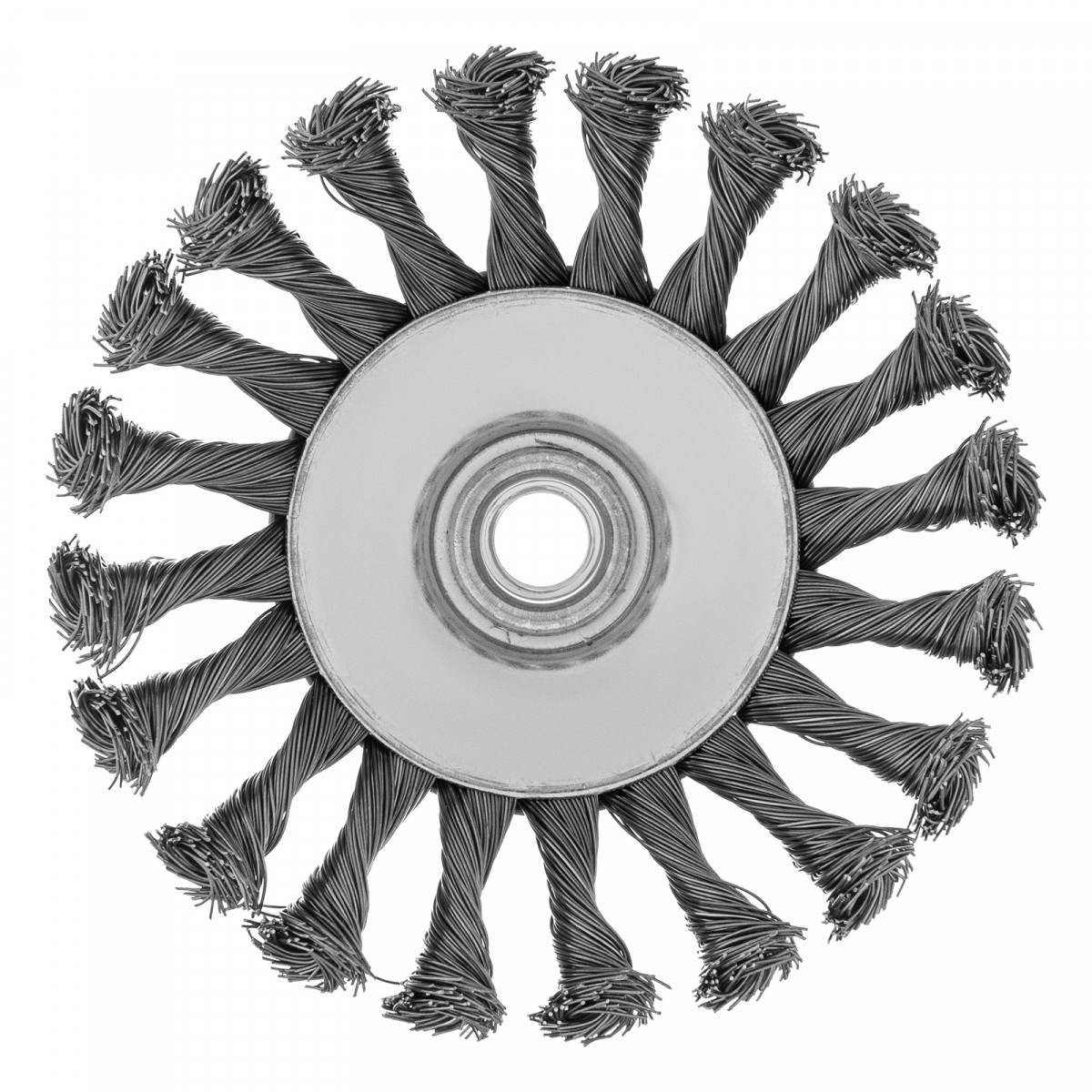 Щетка Matrix «тарелка» 74611 диаметром 125 мм, с щетиной из крученой проволоки толщиной 0,5 мм, устанавливается на УШМ при помощи гайки М14. Выполнена в форме тарелки, за счет чего подходит для грубой (черновой) обработки плоских и угловых поверхностей. Удаляет ржавчину, загрязнения, лакокрасочные покрытия, подходит для зачистки сварных швов. Использование на скорости до 12500 об/мин позволяет продлить срок службы насадки.