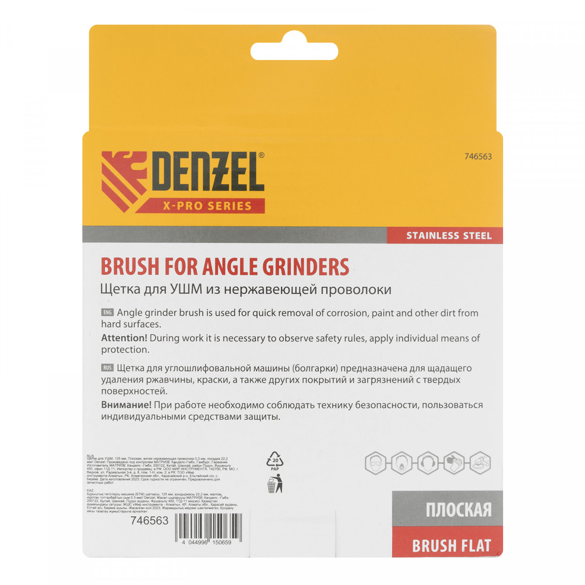 Щетка для УШМ, 125 мм, "Плоская", витая нержавеющая проволока 0.3 мм, посадка 22.2 мм Denzel