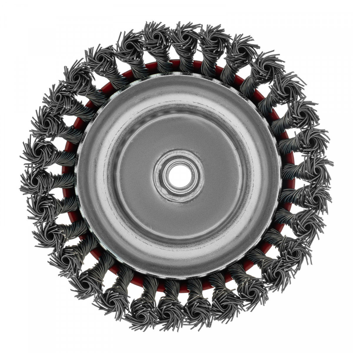 Щетка Matrix «Чашка» 74626 диаметром 150 мм, с присоединительной резьбой М14, с щетиной из крученой проволоки диаметром 0,8 мм, устанавливается на УШМ, поддерживающую работу со скоростью 4500 об/мин. Щетина предназначена для грубой (черновой) обработки поверхностей, более агрессивной по сравнению с щетиной 0,5 мм. Изделие подходит для удаления загрязнений, снятия толстого слоя ржавчины, ЛКМ, зачистки сварных швов.