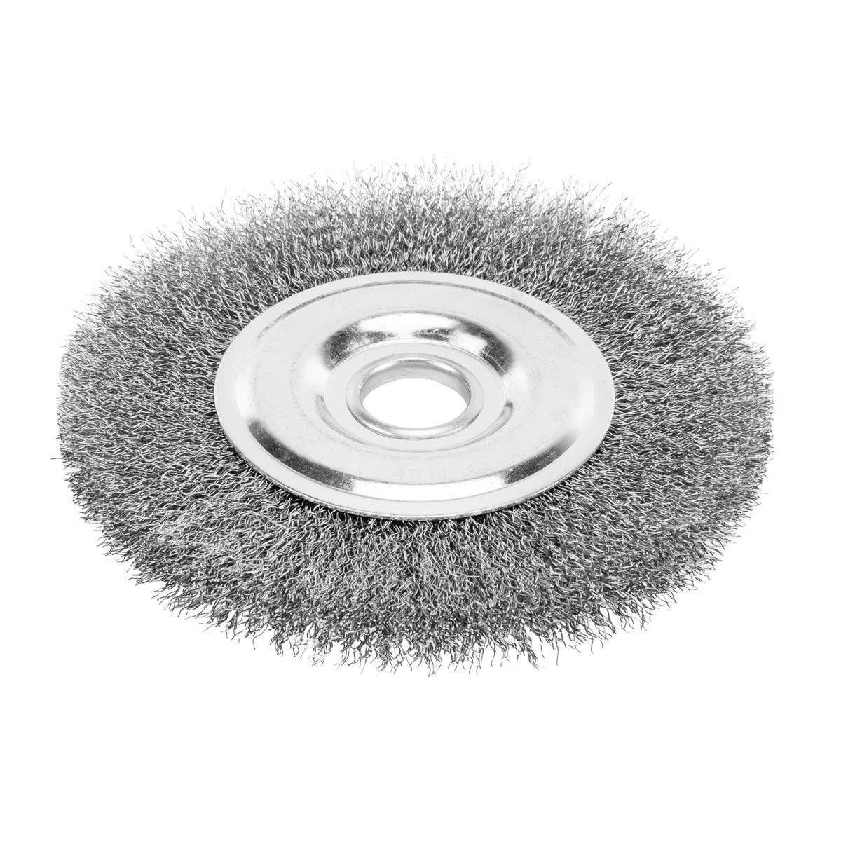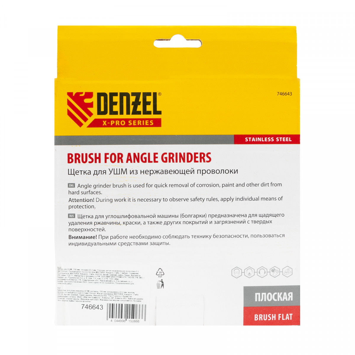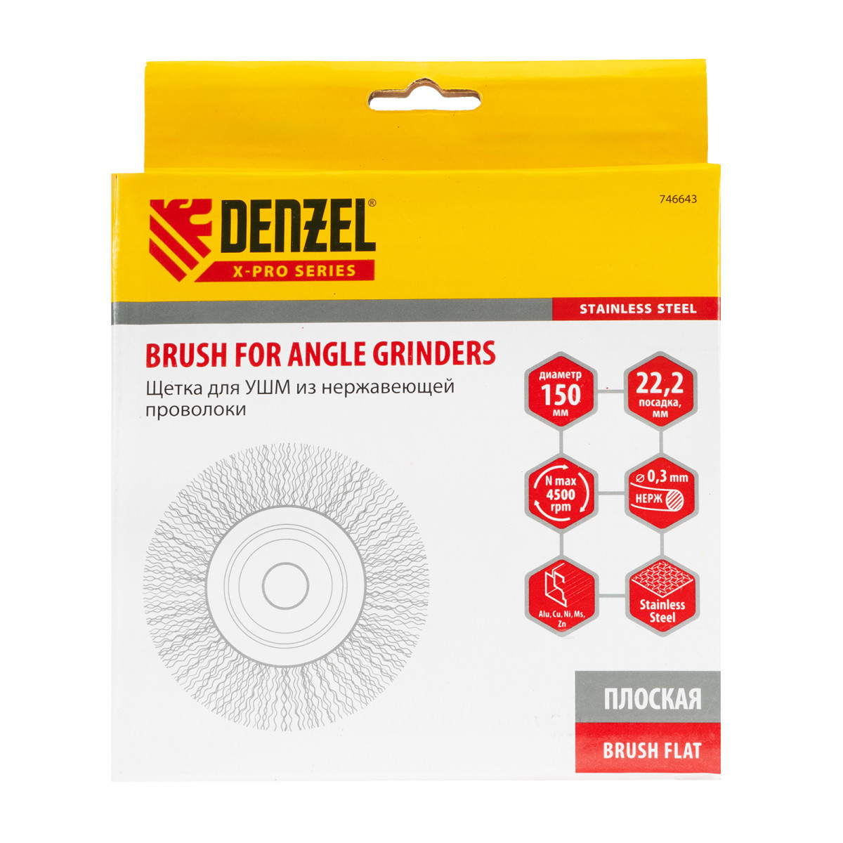 Щетка для УШМ, 150 мм, "Плоская", витая нержавеющая проволока 0.3 мм, посадка 22.2 мм Denzel