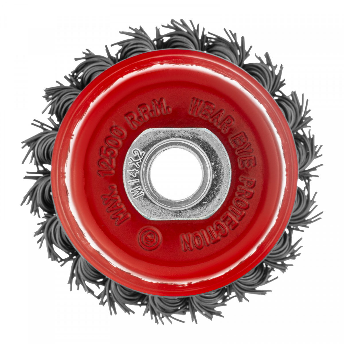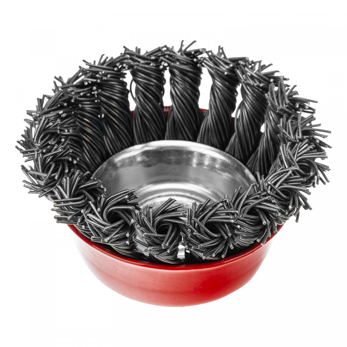 Щетка Matrix «Чашка» 74622 диаметром 75 мм, с присоединительной резьбой М14, с щетиной из крученой проволоки диаметром 0,8 мм, устанавливается на УШМ, поддерживающую работу со скоростью 12500 об/мин. Щетина предназначена для грубой (черновой) обработки поверхностей, более агрессивной по сравнению с щетиной 0,5 мм. Изделие подходит для удаления загрязнений, снятия толстого слоя ржавчины, ЛКМ, зачистки сварных швов.