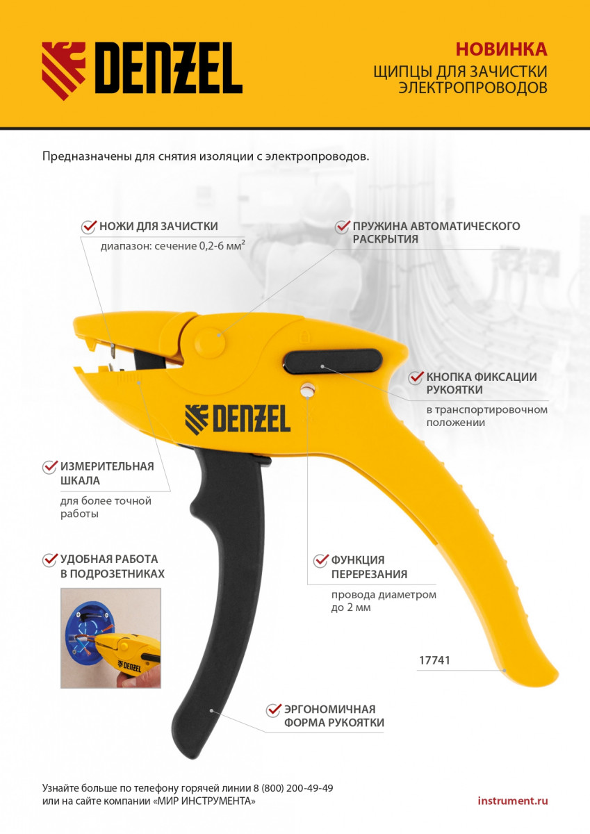 Щипцы Denzel 17741 предназначены для зачистки электропроводов сечением 0,2-6 кв. мм (10-24 AWG) и имеют дополнительную функцию обрезания проводов диаметром до 2 мм. Форма инструмента облегчает работу в труднодоступных местах, поэтому он оптимален для установки подрозетников. Щипцы пригодятся начинающим мастерам и профессионалам для проведения электромонтажных работ.