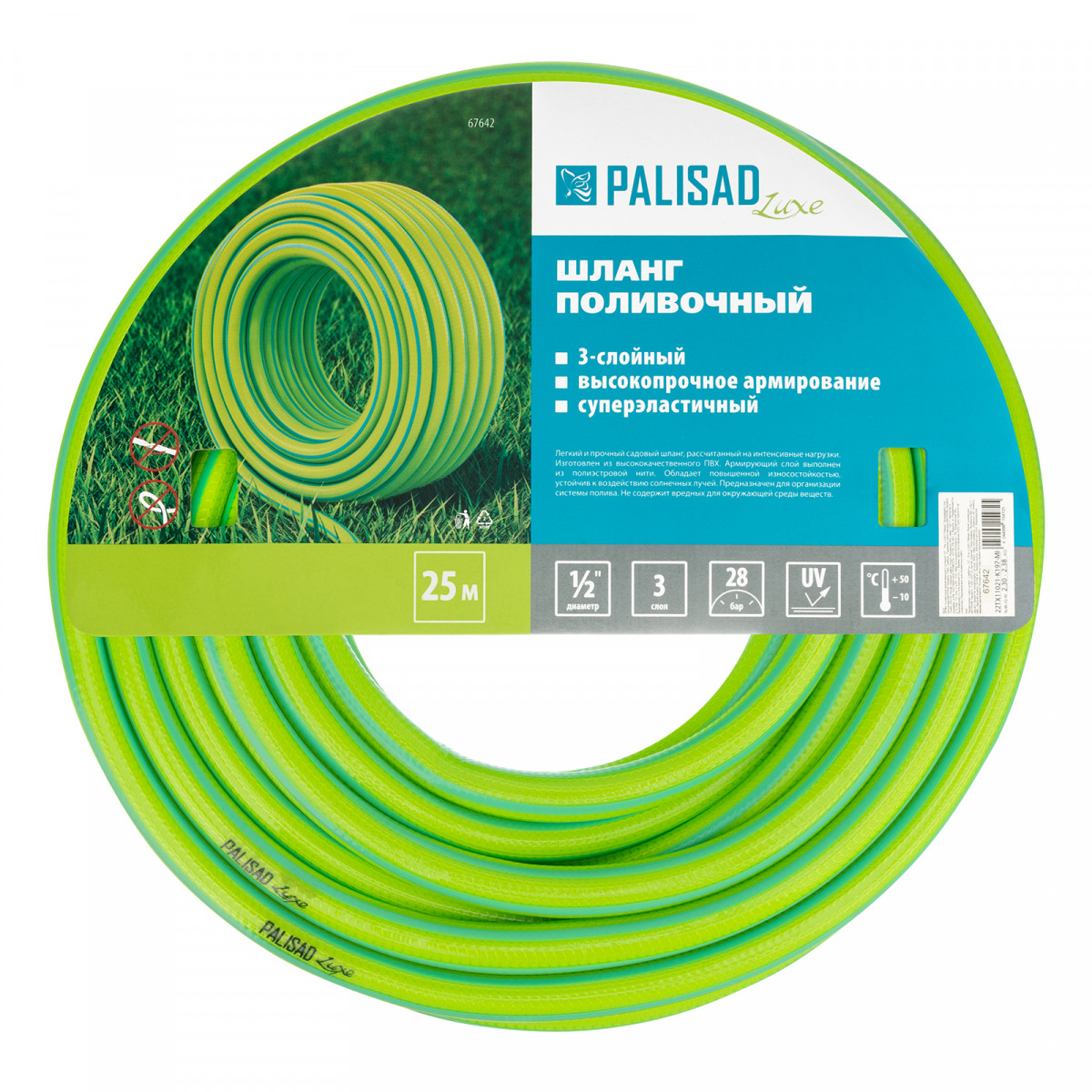 Шланг поливочный армированный 3-слойный Palisad LUXE 67642 диаметром 1/2" и длиной 25 м — незаменимый помощник для садоводов. Используется для ручного или автоматического орошения растений. Совместим со всеми поливочными системами ТМ Palisad.