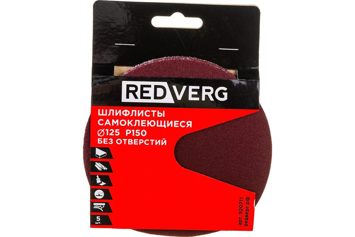 Шлифлист REDVERG самоклеющийся без отверстий 125мм Р150 (5шт)
