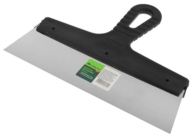 Полотно шпателя изготовлено из нержавеющей стали 30Х13 (12Х17). Облегченная ручка из ударопрочной пластмассы. Ручка шпателя имеет специальную (изогнутую) форму, что обеспечивает максимально удобную работу. Шпатель предназначен для нанесения, выравнивания и сглаживания шпаклевочного слоя на больших и малых поверхностях.