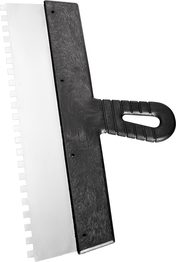 Полотно шпателя изготовлено из нержавеющей стали 30Х13 (12Х17). Рабочая поверхность инструмента имеет квадратные зубья. Облегченная ручка из ударопрочной пластмассы. Ручка шпателя имеет специальную (изогнутую) форму, что обеспечивает максимально удобную работу. Шпатель предназначен для нанесения, выравнивания и сглаживания шпаклевочного слоя на больших и малых поверхностях.