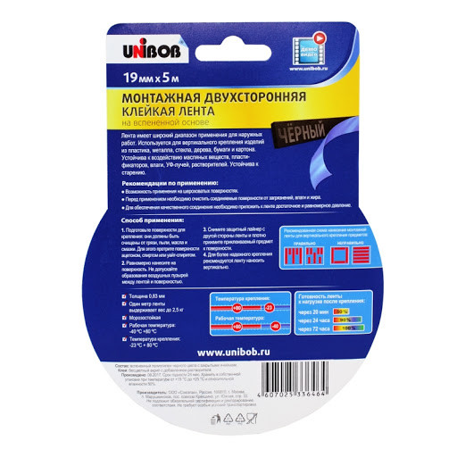 Скотч двухсторонний UNIBOB 19мм*5м вспененная, черный