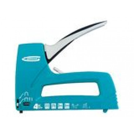 Степлер механический Gross 41005 с корпусом из формованного пластика синего цвета является по-настоящему универсальной моделью и может работать со скобами типов 36 или 53, штифтами типа 500, гвоздями типа 300. Его можно зарядить скобами размером 8-14 мм или гвоздями/штифтами длиной 16 мм. Инструмент подходит для работ с корпусной мебелью и может широко применяться в быту, позволяя выполнять многие операции во время проведения строительных, отелочных и ремонтных мероприятий.