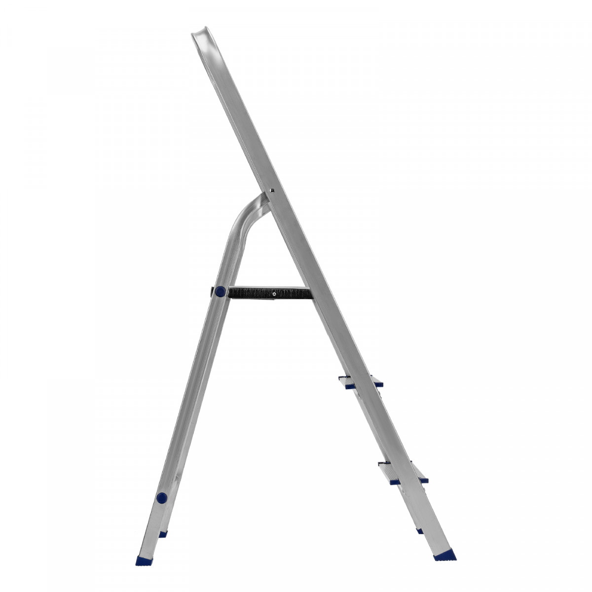 - Надежность — рама из прямоугольного алюминиевого профиля выдерживает нагрузку до 150 кг, широкие ступени закреплены заклепками.