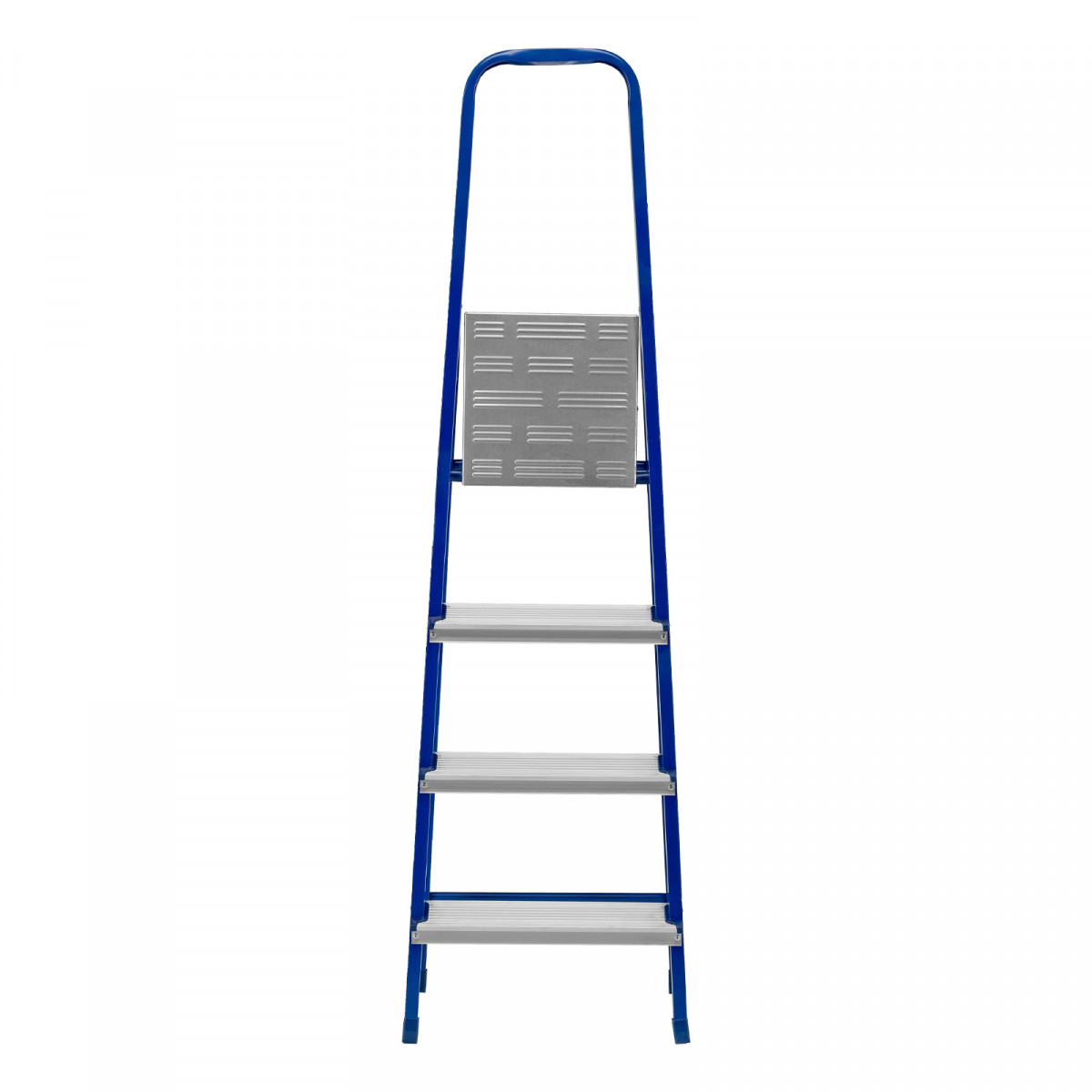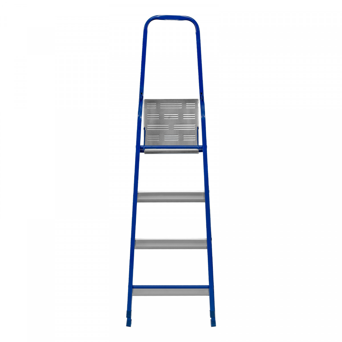 - Надежная конструкция — рама изготовлена из профилированной стали, стальная верхняя площадка с зацепами прочно фиксирует стремянку в рабочем положении.