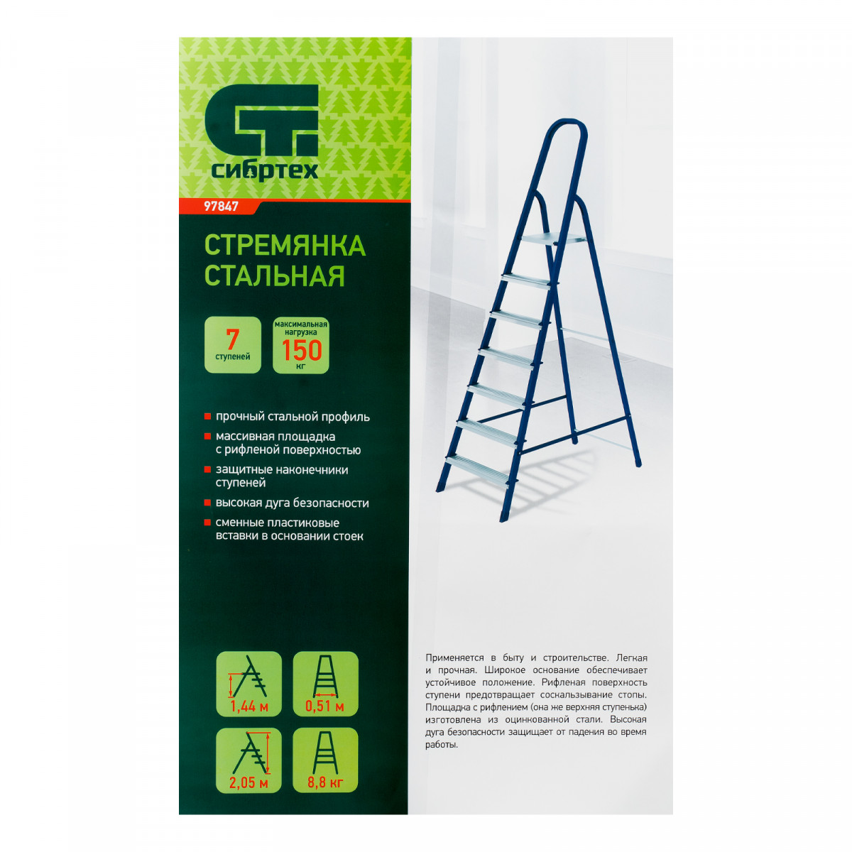 - Повышенная прочность — рама и ступеньки изготовлены из стали и выдерживают нагрузку до 150 кг.
