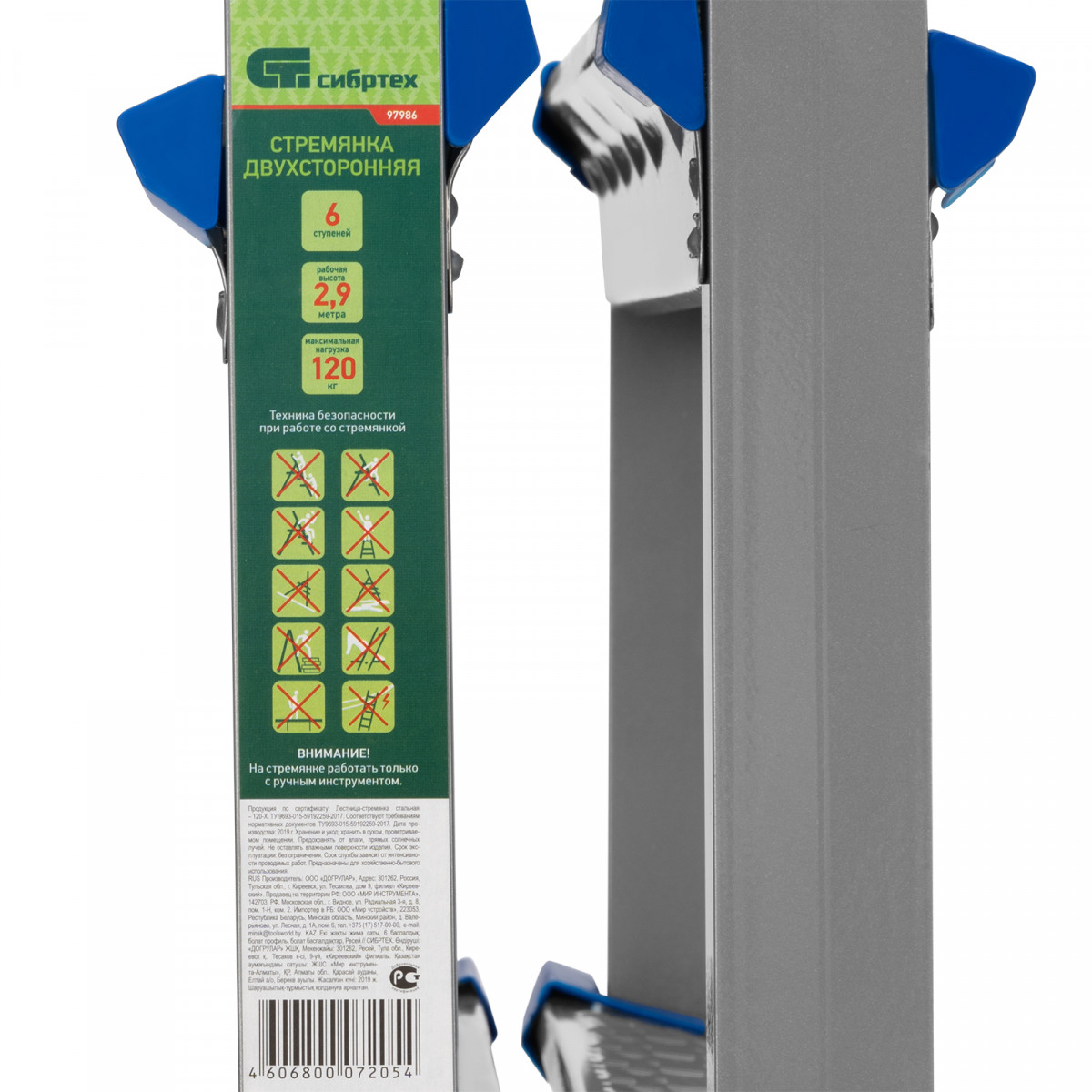 Стремянка двухсторонняя Сибртех 97986 со стальным профилем и 6 стальными ступенями помогает решать бытовые задачи на высоте, превышающей человеческий рост. Ее используют, чтобы доставать предметы с антресолей или шкафов, проводить уборку, менять лампочки, вешать полки или картины. Работать с электроинструментом на ней не рекомендуется. Стремянка с пластиковым складным механизмом повышенной стабильности и широким основанием очень устойчива на ровной поверхности. Площадка находится на высоте 131,5 см от опорной поверхности, рабочая высота стремянки составляет 331,5 см (при среднем росте пользователя 170 см).