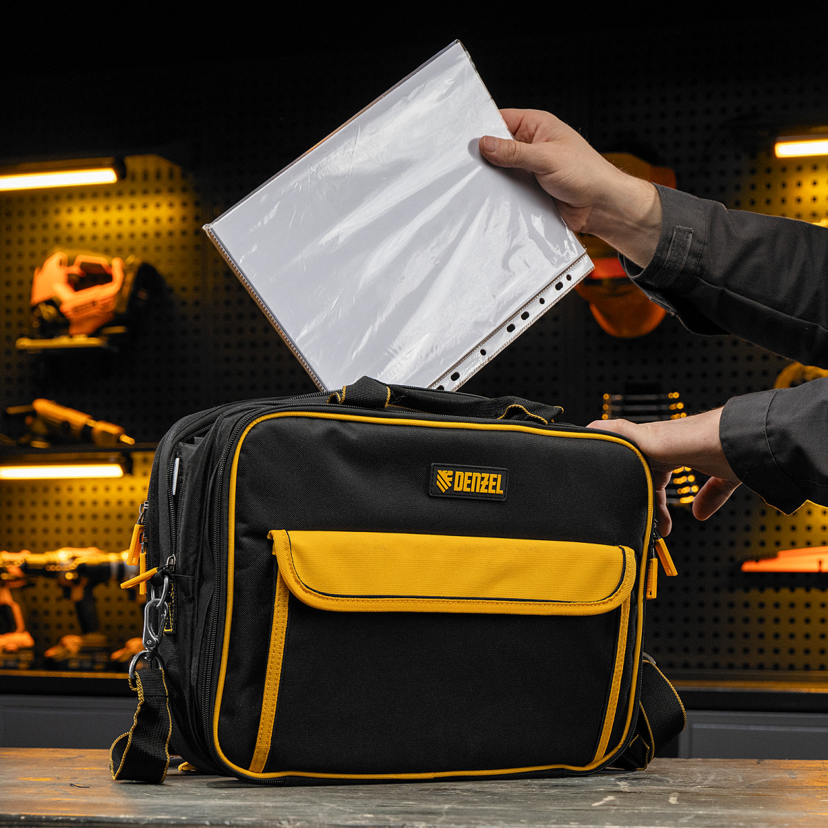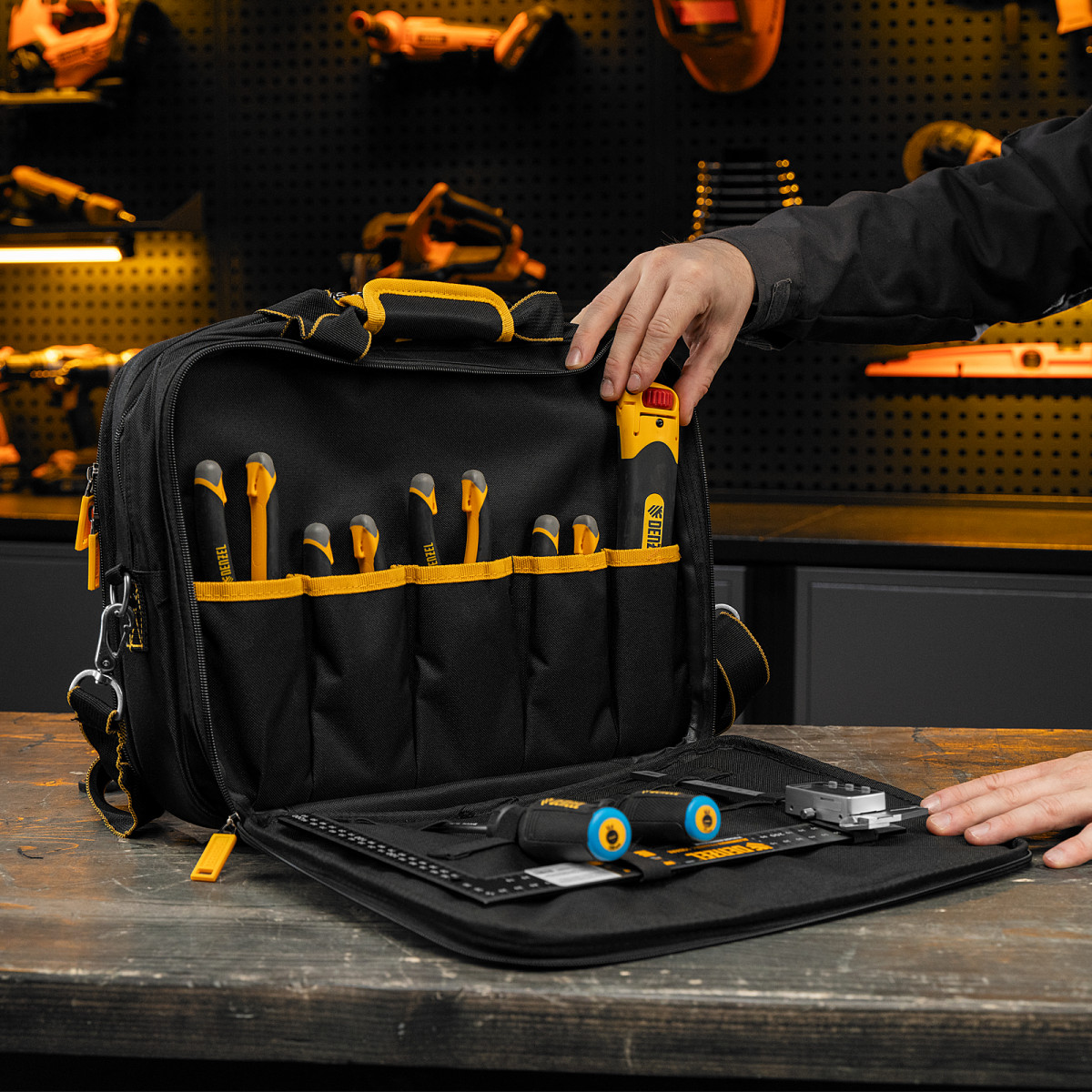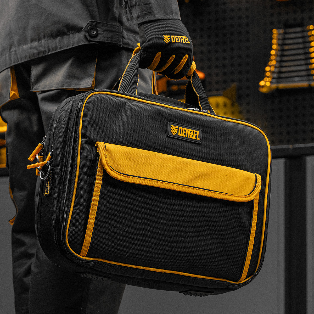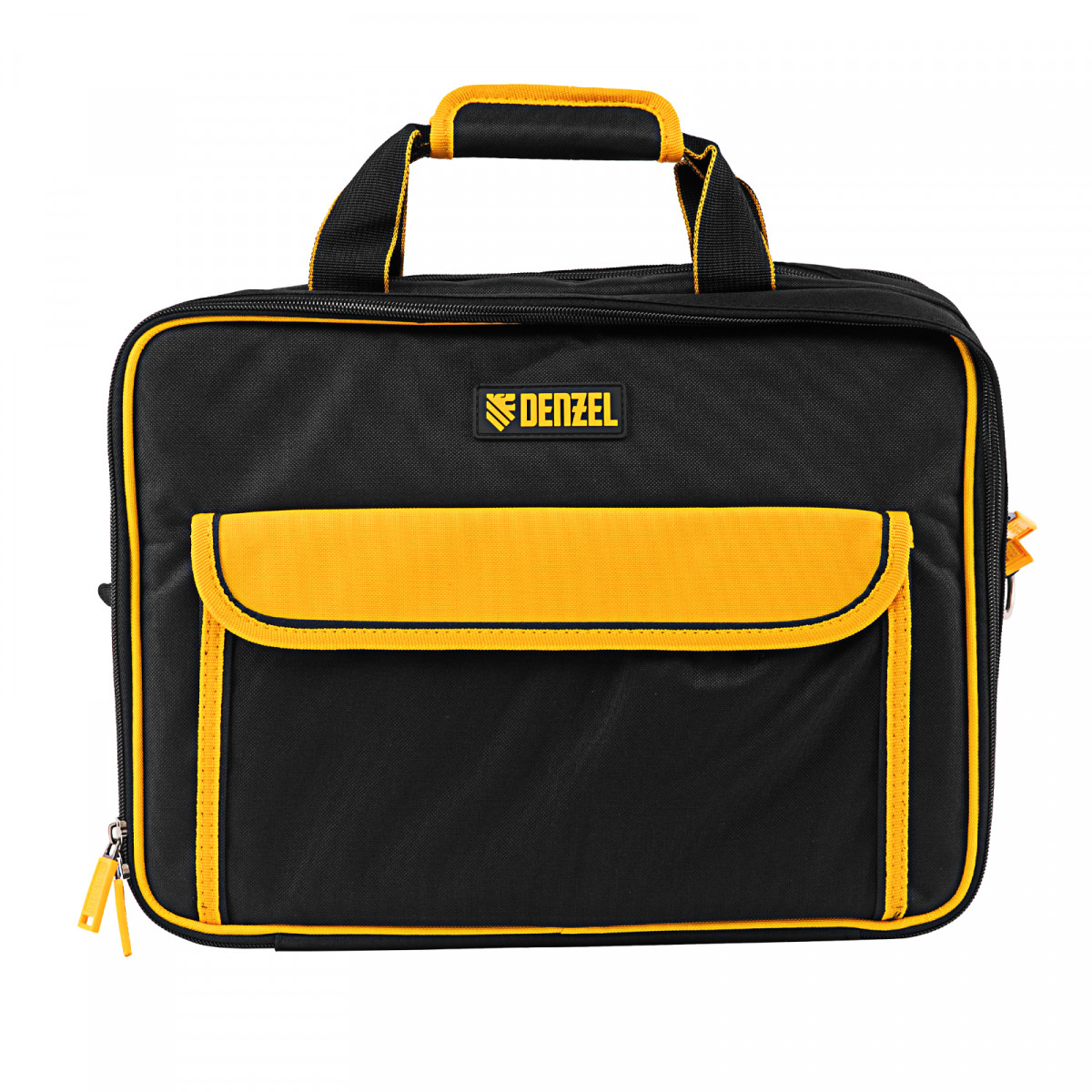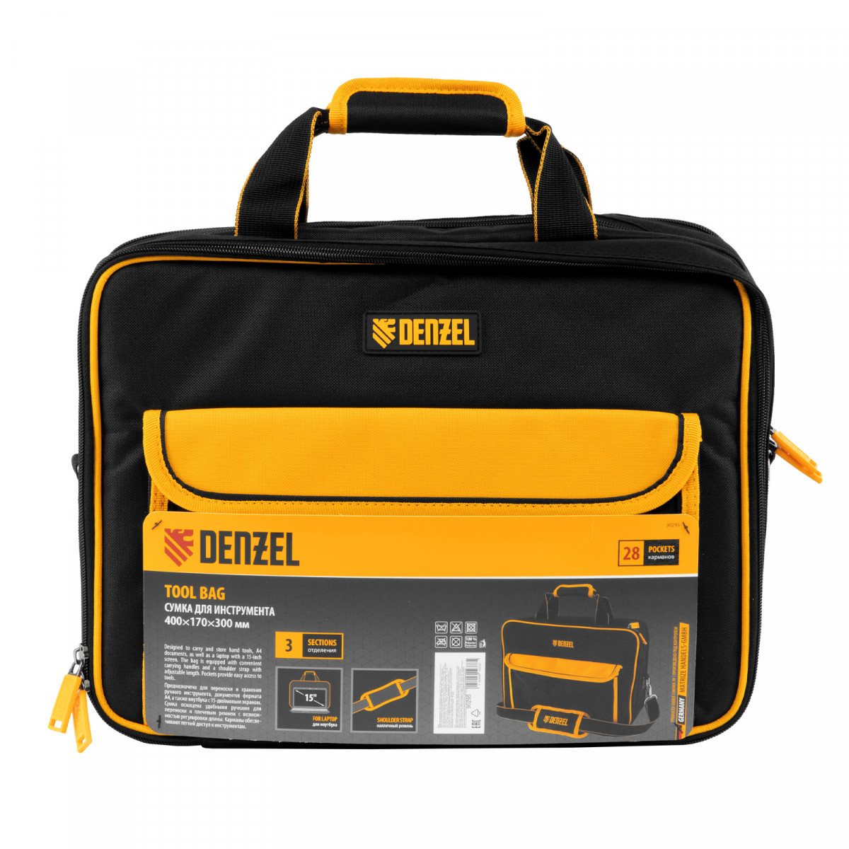 Сумка Denzel 90295 габаритами 400 х 170 х 300 мм, с наплечным ремнем, имеет 3 отделения и 28 карманов, в которых можно разместить необходимые инструменты, оснастку и расходники. Пригодится дома, в гараже и в поездке.