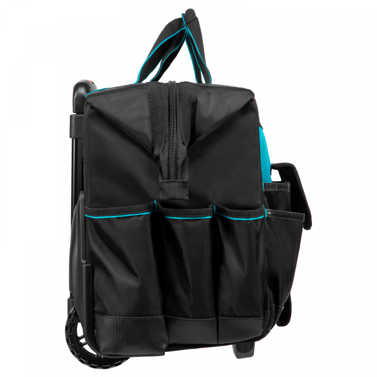 - Мобильность — сумку с инструментами легко перемещать при помощи колес и телескопической рукоятки.