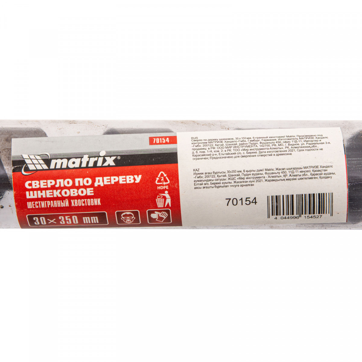 Сверло по дереву шнековое, 30 х 350 мм, шестигранный хвостовик Matrix