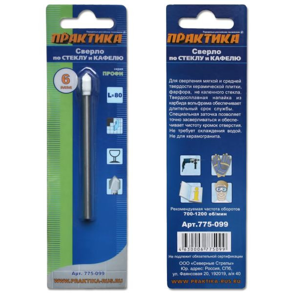 Сверло по кафелю/стеклу 6 мм серия Профи V-тип Практика