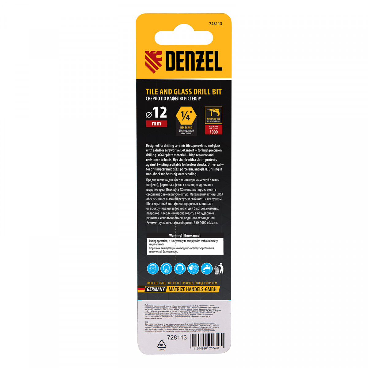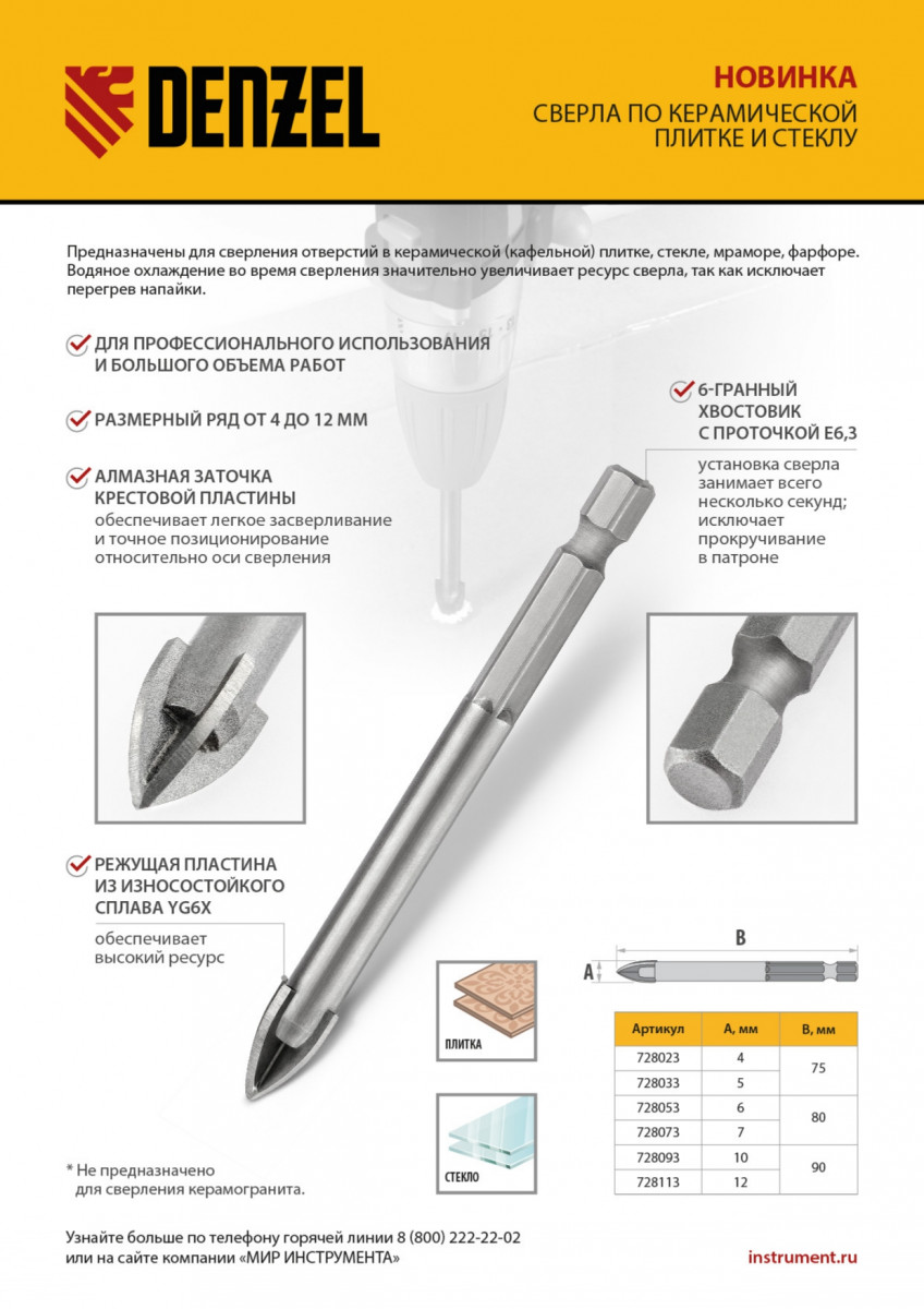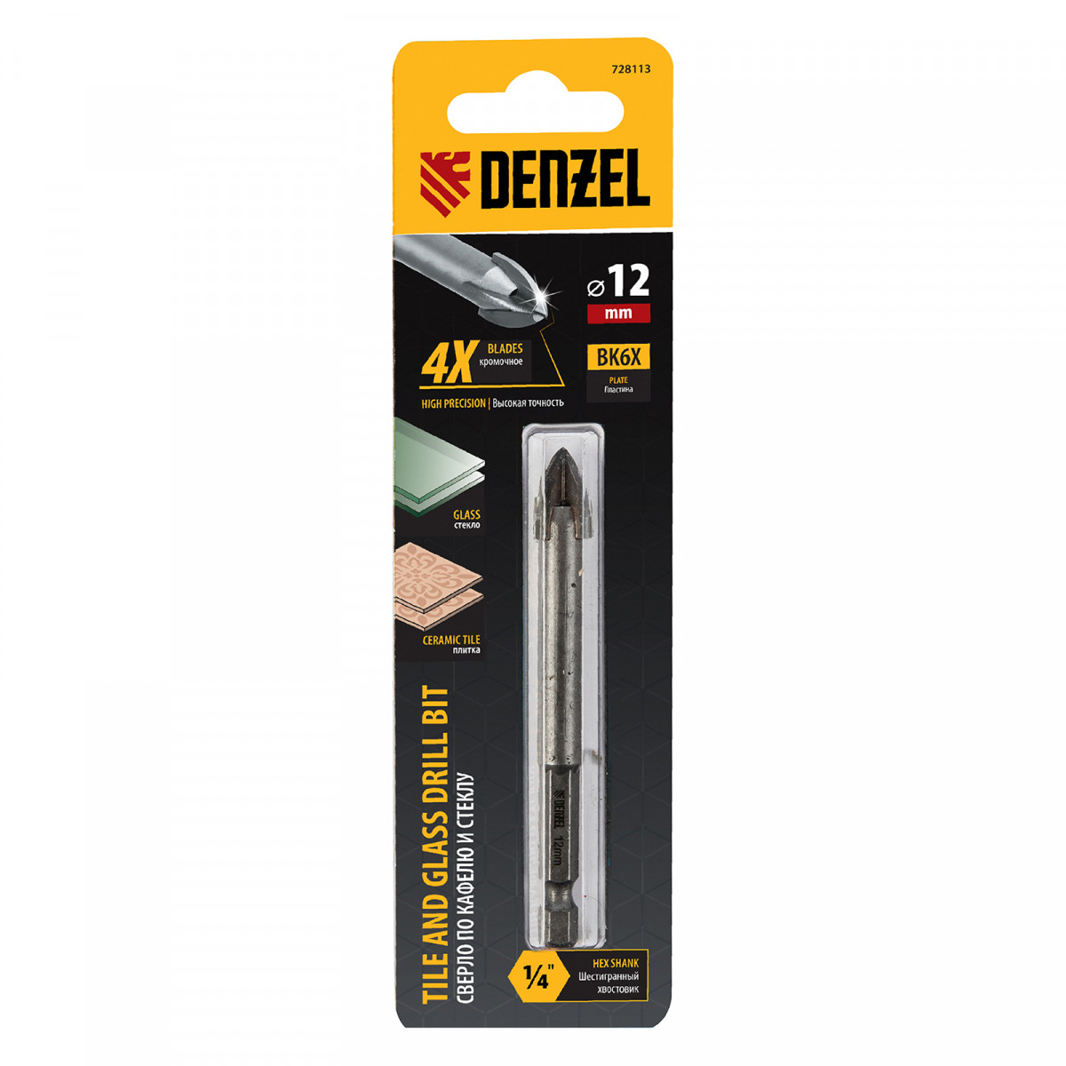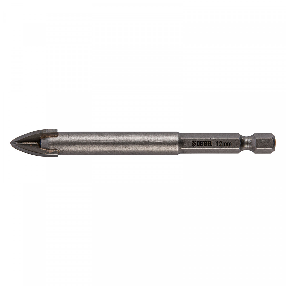 Сверло по керамической плитке 12 мм, крестовая пластина, шестигранный хвостовик// Denzel